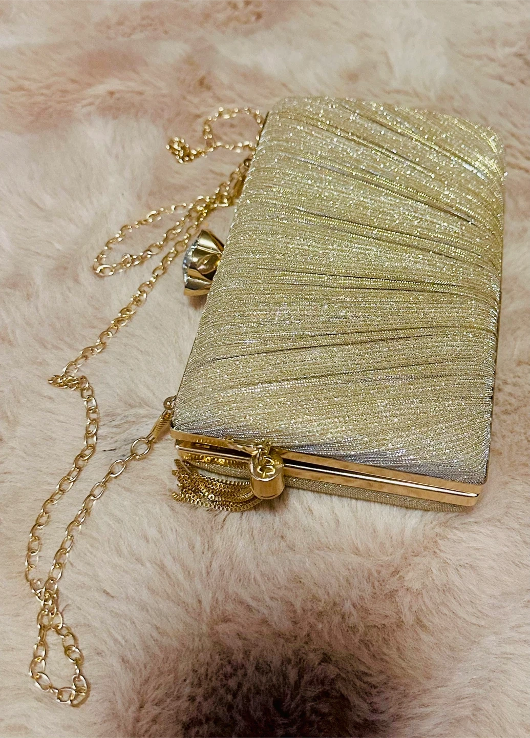 This is a beautiful gold evening clutch, perfect for a night out or special occasion! It comes with a delicate chain strap, so you can carry it on your shoulder or as a clutch. The gold colour is so elegant and versatile, it will match any outfit. It's in great condition and ready for a new home!