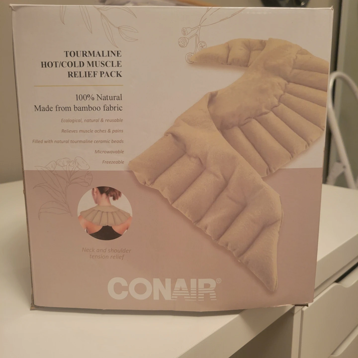 I'm selling a Conair Tourmaline Hot/Cold Muscle Relief Pack! It's made from 100% natural bamboo fabric and is ecological, natural, and reusable. This pack is designed to relieve muscle aches and pains, and is filled with natural tourmaline ceramic beads. It's microwavable and freezeable for neck and shoulder tension relief