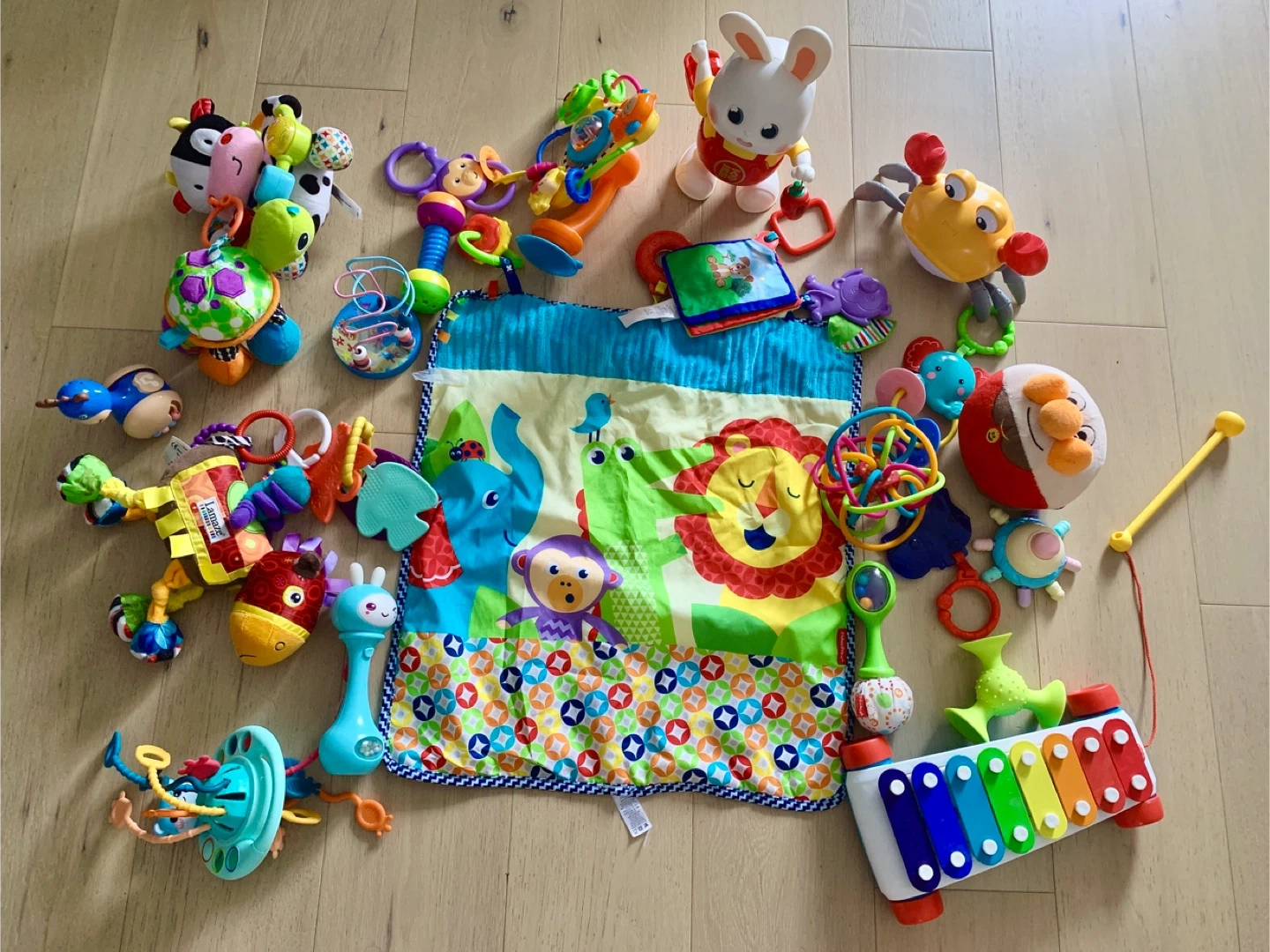 Selling a collection of baby toys. Includes a colourful activity mat with animal designs, several rattles and teething toys, and a mini xylophone with a mallet. Perfect for sensory development and playtime for little ones