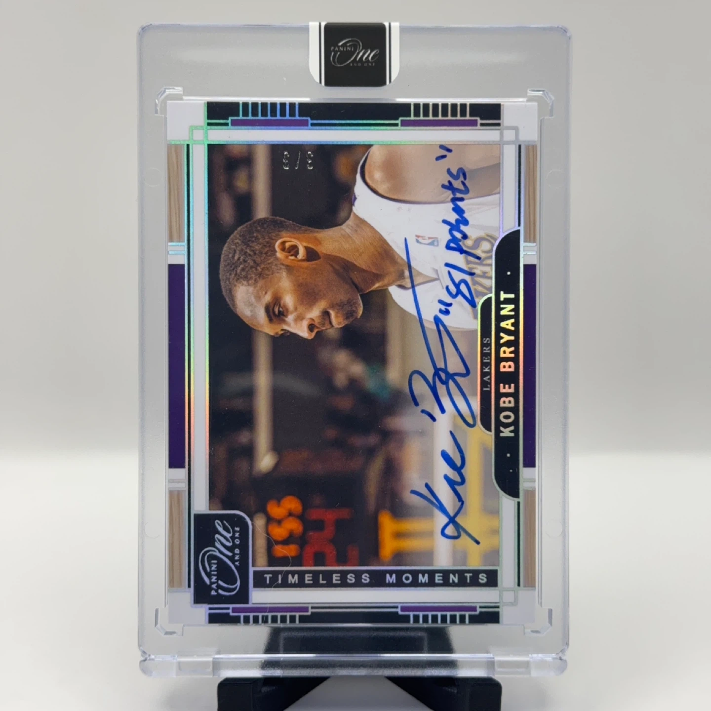 Fully custom-made 2023–2024 Panini One Kobe Bryant Timeless Moments Auto – 3/3 style card for display purposes only. NOT authentic or officially licensed.