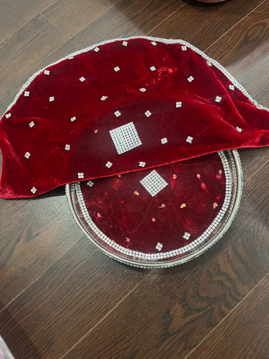 Selling a decorative red velvet tray with a matching cover. It features silver rhinestone detailing around the edges and on the velvet. Perfect for adding a touch of elegance to any space!