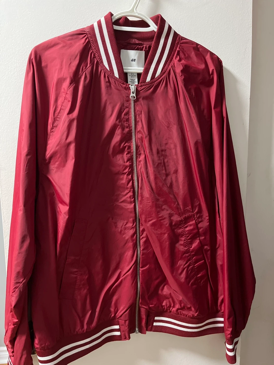 Selling a red H&M bomber jacket in size L. It's in great condition and perfect for layering! The jacket features a classic bomber style with striped detailing on the collar, cuffs, and hem. It's lightweight and comfortable, making it a great addition to your wardrobe