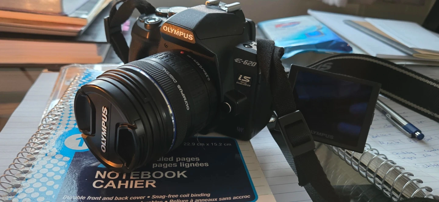 Selling an Olympus E-620 DSLR camera. It comes with multiple lenses and a carrying bag. Great for photography enthusiasts!