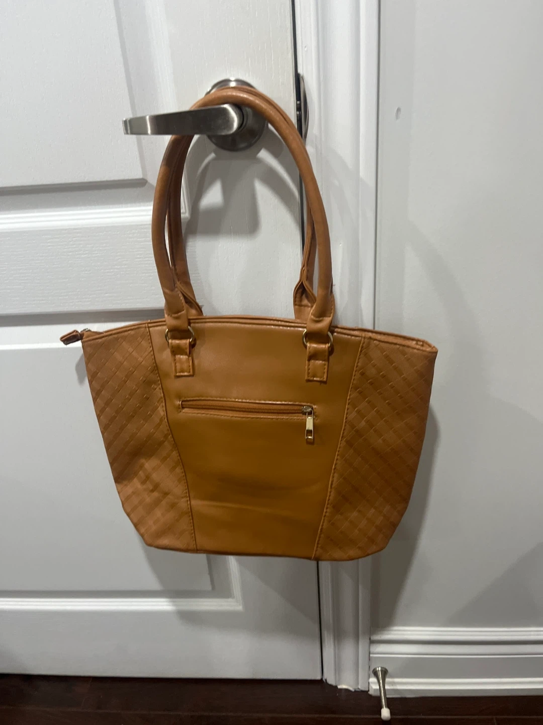 A stylish brown tote bag, perfect for everyday use! It features a zippered closure and comfortable shoulder straps. The bag is in good condition and ready for a new home