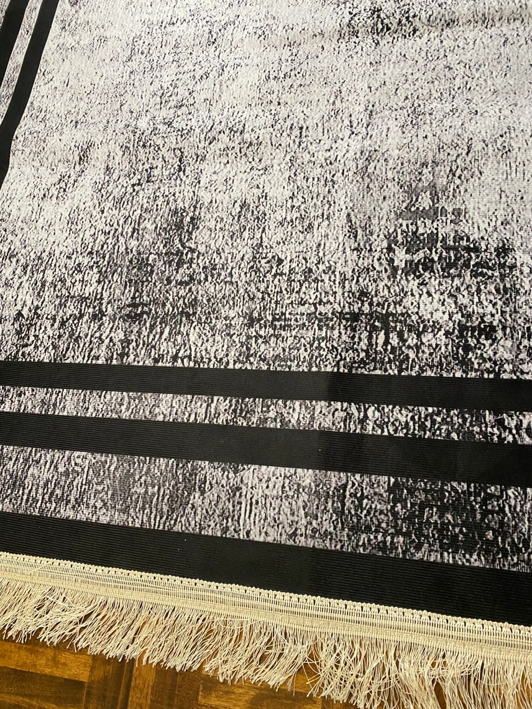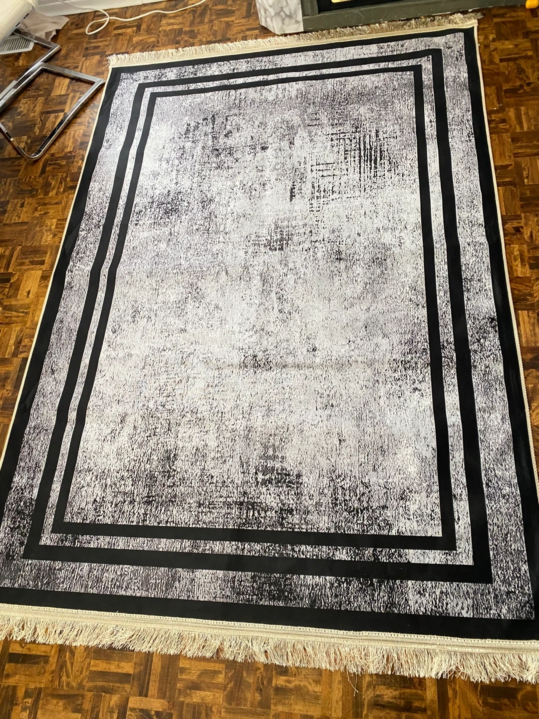 Selling a stylish black and white area rug. It measures approximately 94 inches in length and 64 inches in width. It would be a great addition to any room!