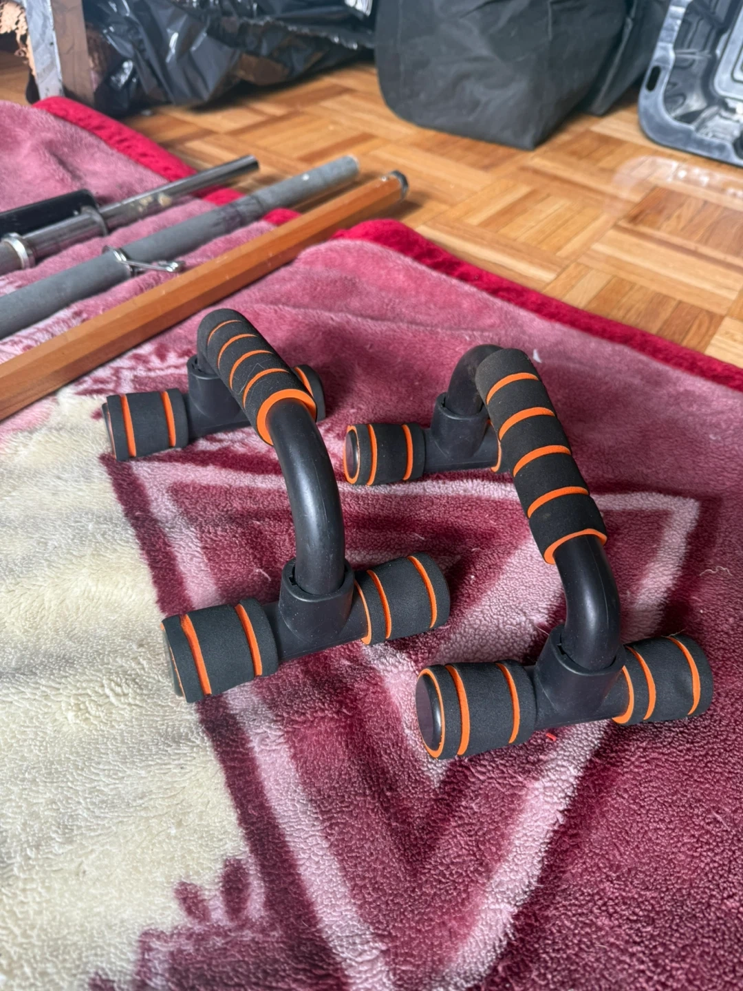 Selling a pair of push up bars. They have foam grips for comfort. Great for home workouts and building upper body strength!