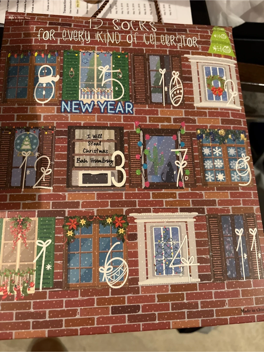 Get into the holiday spirit with this fun advent calendar! It includes 12 pairs of socks, perfect for every kind of celebrator. The socks are made of 96% polyester, 2% spandex, and 2% other fiber. Machine wash cold, gentle cycle, and tumble dry low..**pick up on Chandos Drive in Chicopee area of South Kitchener N2A4H8