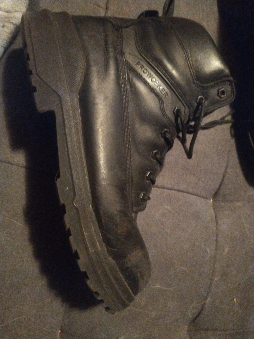 Selling a pair of Proworker safety work boots in black. They are in used condition but still have plenty of life left. The soles have the Kodiak brand logo on them.