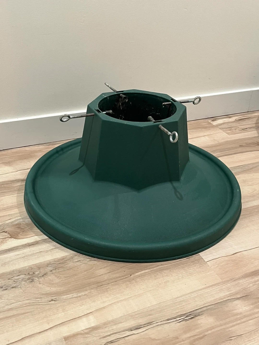 Green tree stand is heavy duty plastic with 4 adjustable screws.
