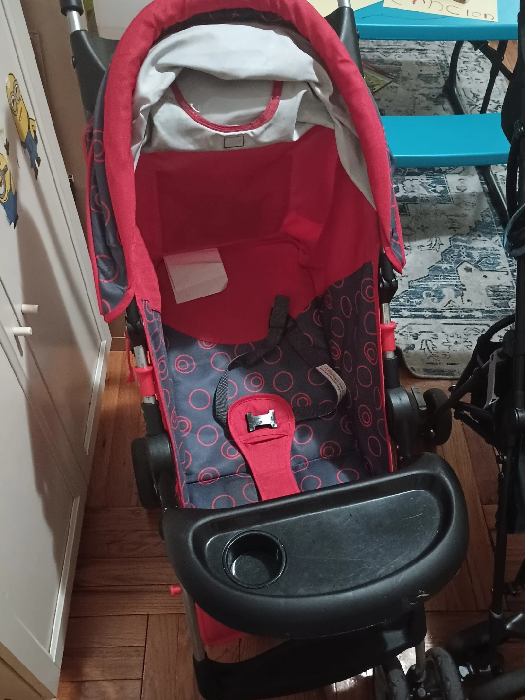 Selling a baby stroller in red and black. It has a convenient tray with a cup holder for easy access to drinks and snacks. The stroller also features a safety harness to keep your little one secure during walks. It's in good condition and ready for a new home!