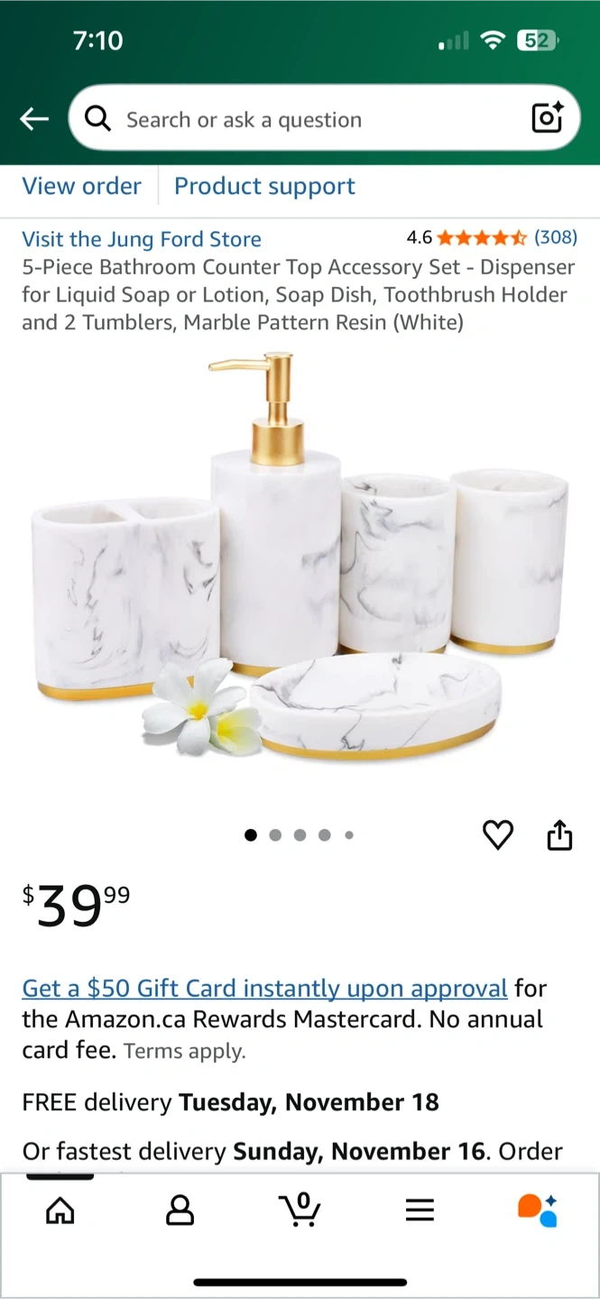 Spruce up your bathroom with this stylish 5-piece marble bathroom accessories set! Includes a soap dispenser, toothbrush holder, two tumblers, and a soap dish. The modern marble design will add a touch of elegance to your space