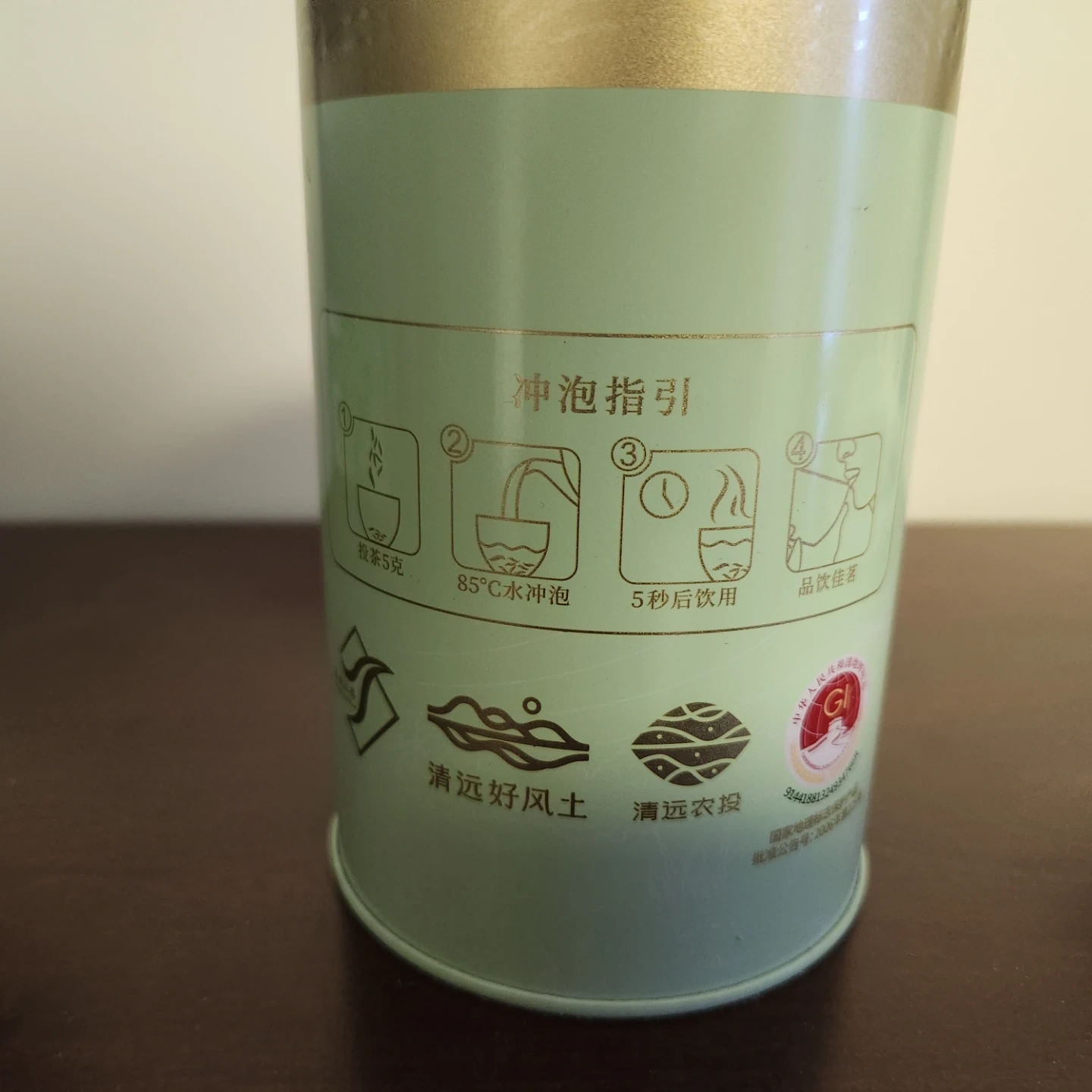 This is a tin of unopened black tea. It contains 90 grams of tea. Brewing instructions are included on the side, recommending 5 grams of tea brewed with 85°C water and enjoyed after 5 seconds.