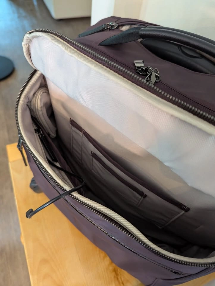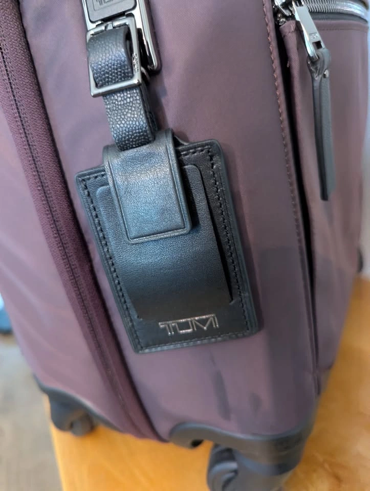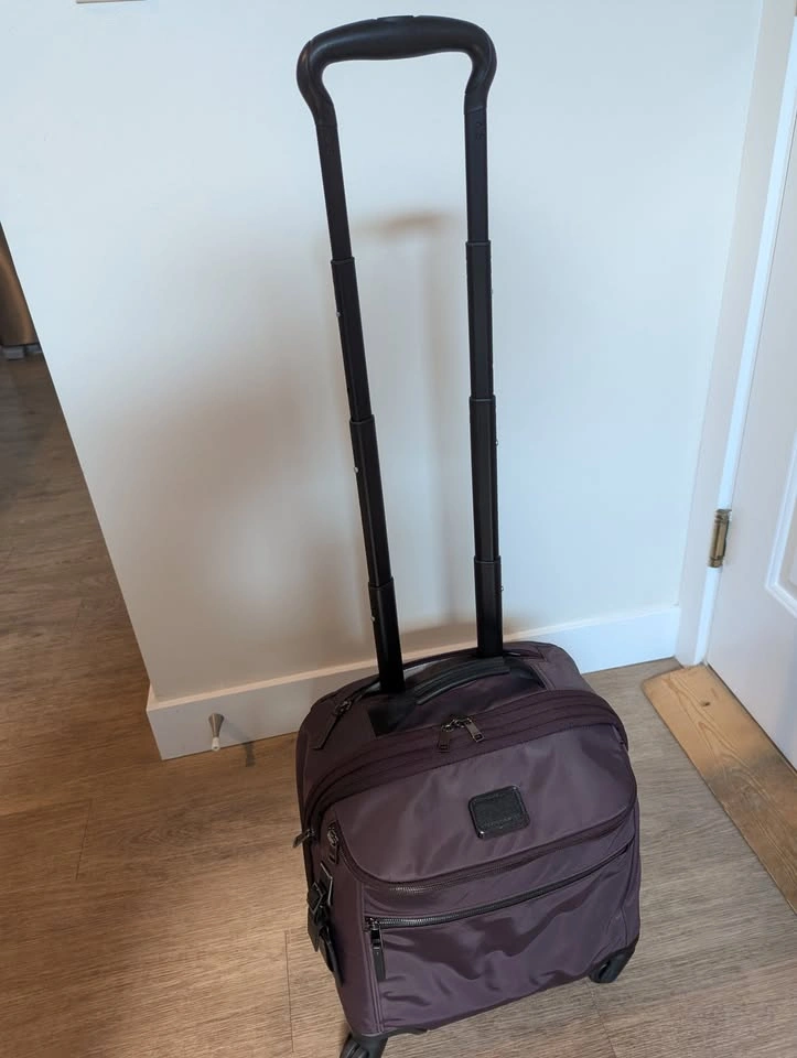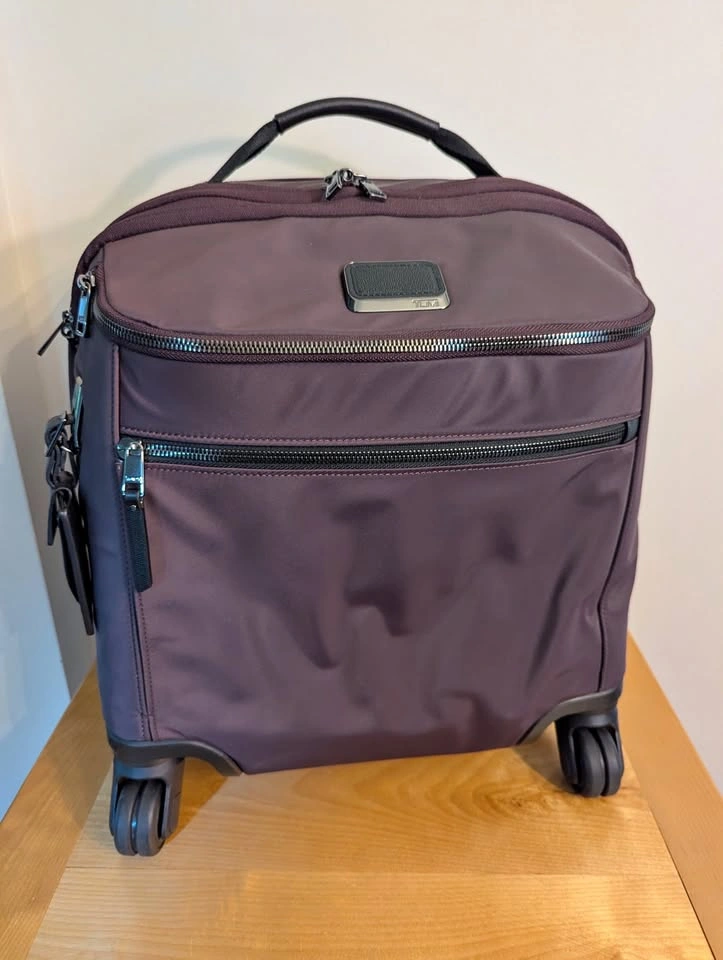 Lightweight and well designed as a compact travel companion. This bag has space for personal items and clothes plus protection for your laptop and tech accessories. Holds up to 14" laptop. Has charging cable and pocket for a charger. Dimensions: 40cm tall, 37cm wide, 20cm depth. Weight is 6.4lbs. Capacity is 21L. Colour is Eggplant (dark purple). Pass through on back to attach to another suitcase. Made from water and stain resistant nylon fabric, easy to clean. 5 stage telescoping handle that zips away. New TUMI luggage tag attached. Wheels are a slimmer profile than traditional wheels, and they consolidate weight while effortlessly gliding from place to place. Cash only, non smoking/ non pet home. Pick up only. Location near 88th Ave and 212th Street Walnut Grove Langley. Prompt pick up please