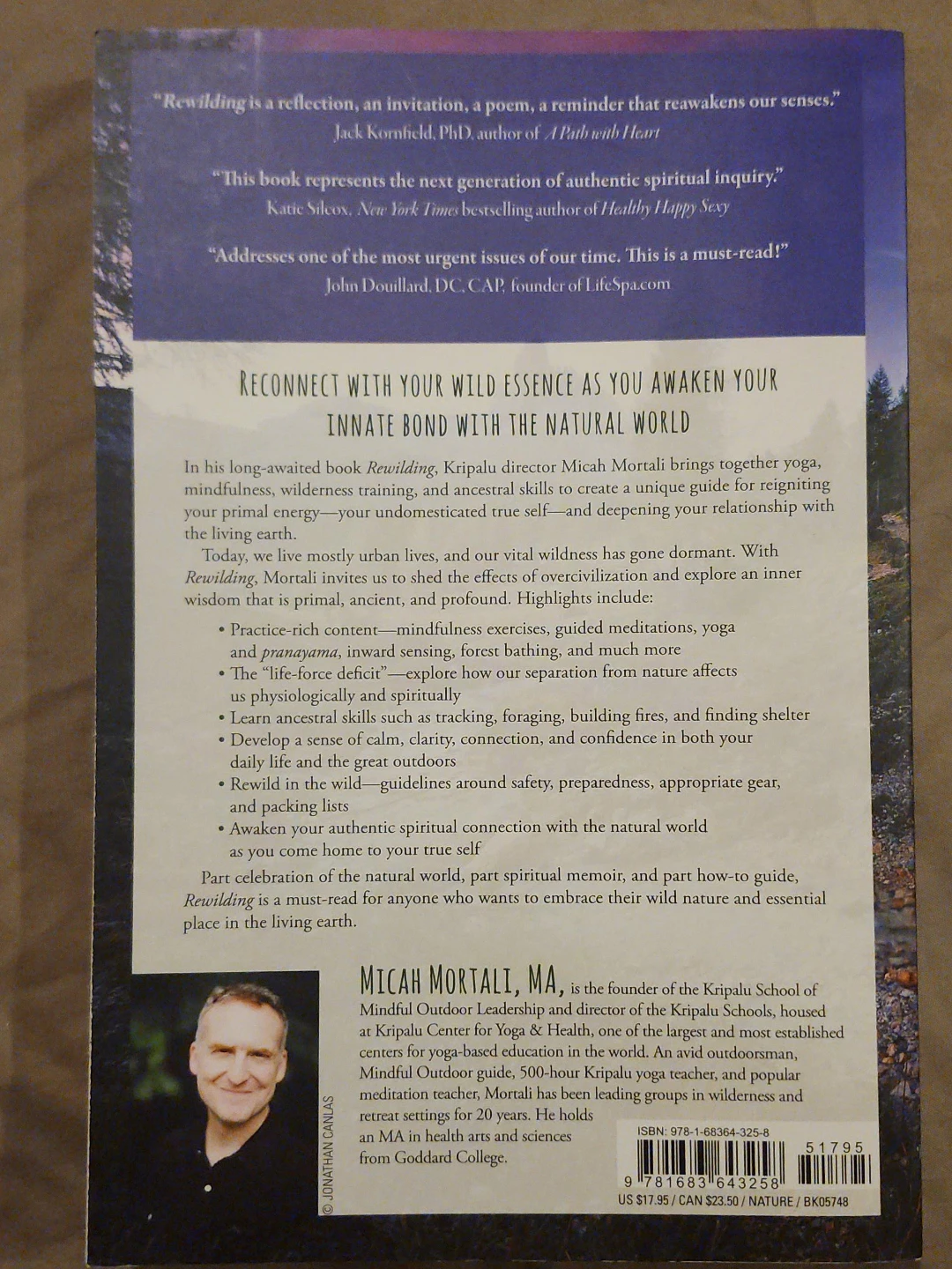 Selling "Rewilding: Meditations, Practices, and Skills for Awakening in Nature" by Micah Mortali. It's a great book for anyone interested in reconnecting with nature and learning mindfulness practices