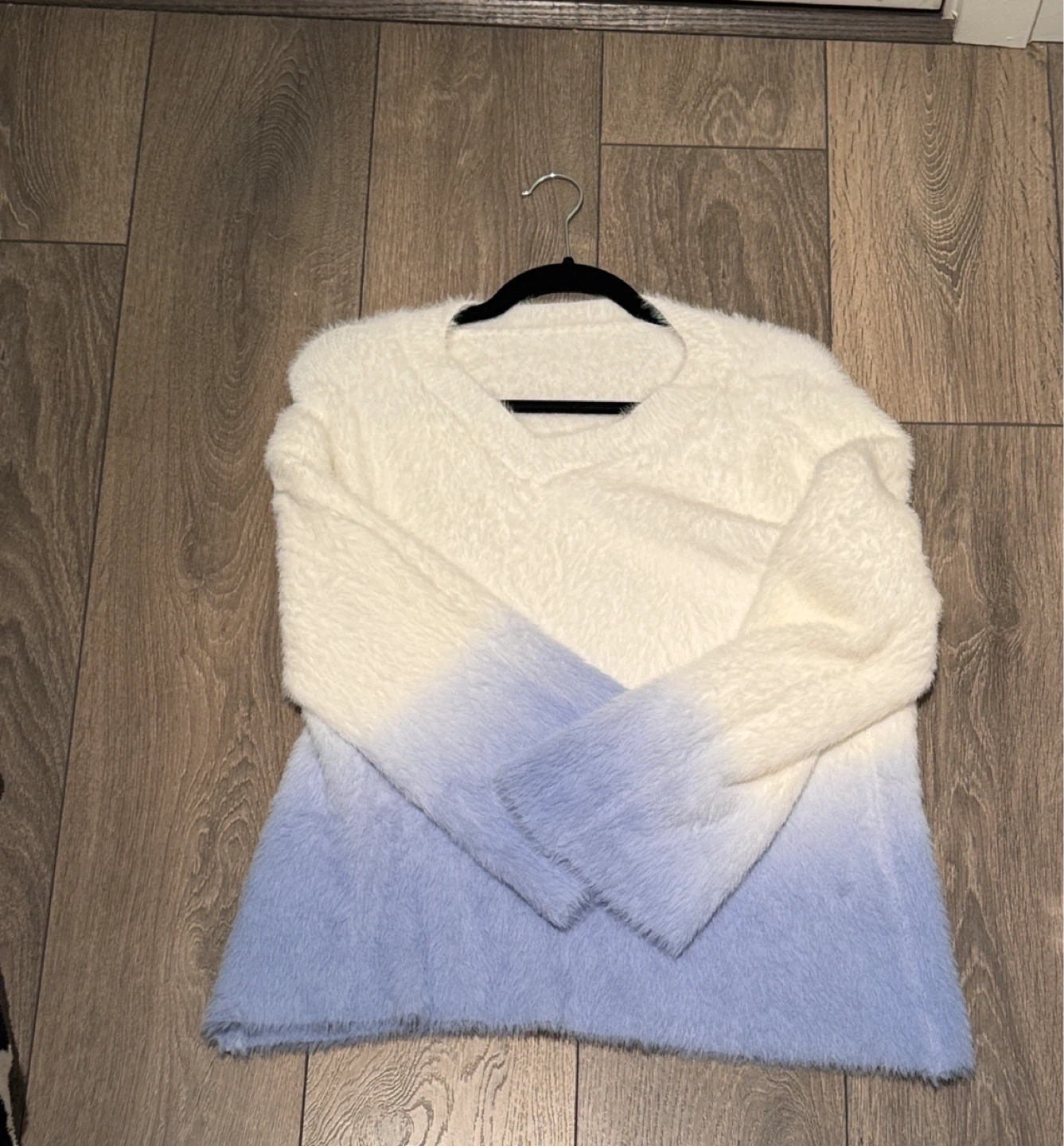 A cozy and stylish ombre fuzzy sweater in white and blue! Perfect for adding a touch of warmth and colour to your wardrobe. It's in great condition and ready for a new home