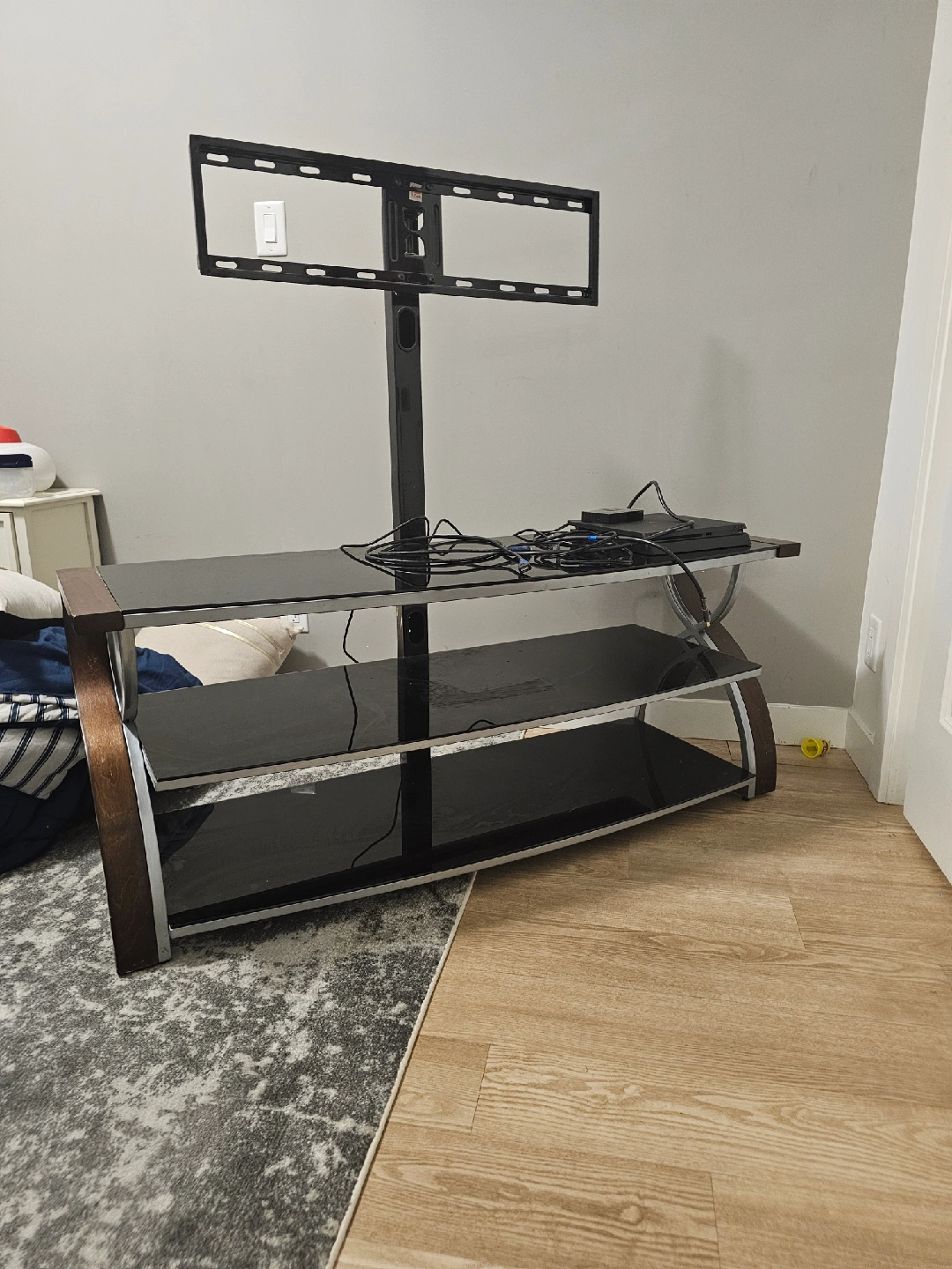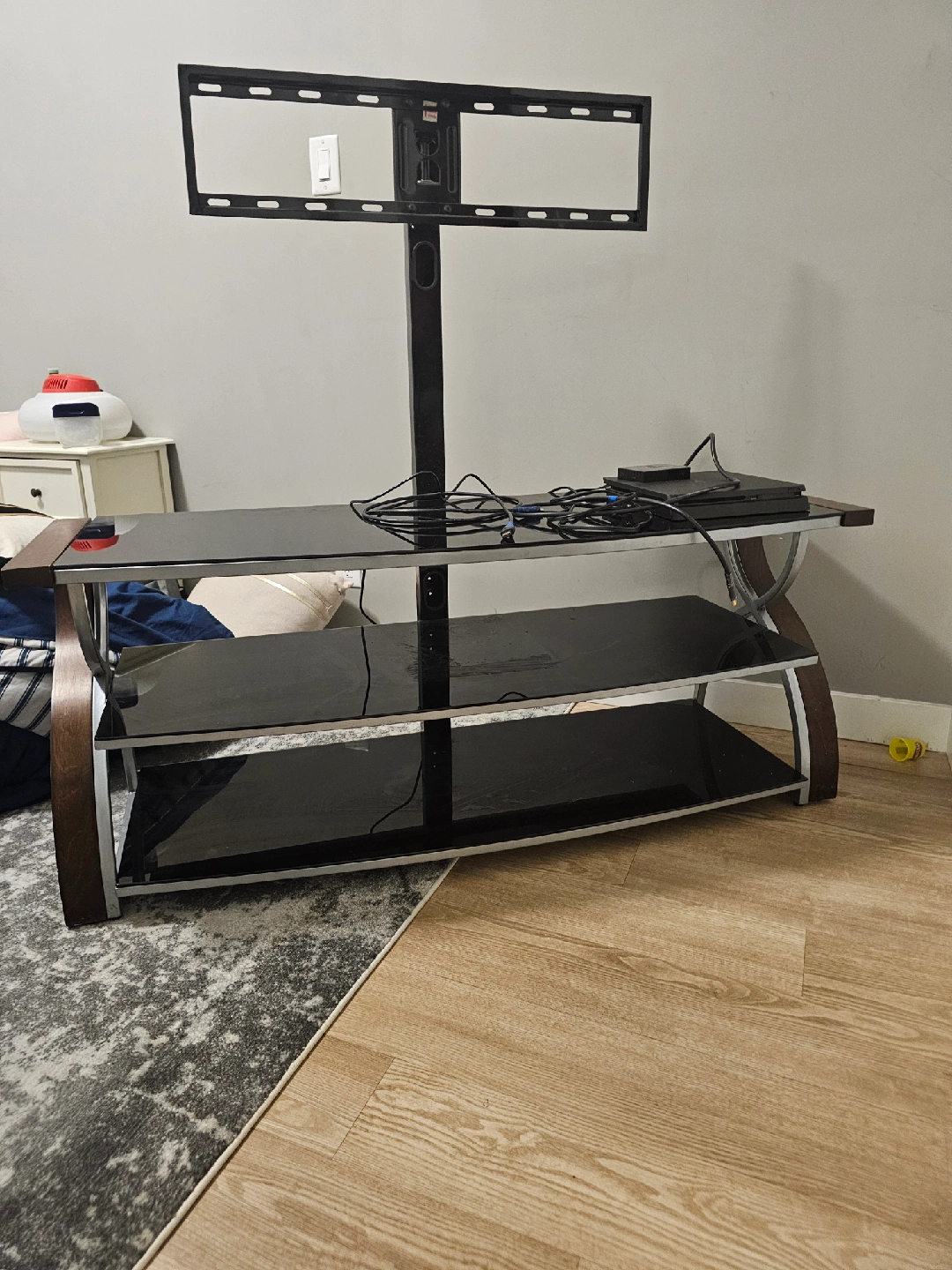 Selling a glass TV stand with a built-in mount. It has a sleek design with multiple shelves for your media devices. Perfect for organizing your entertainment area!