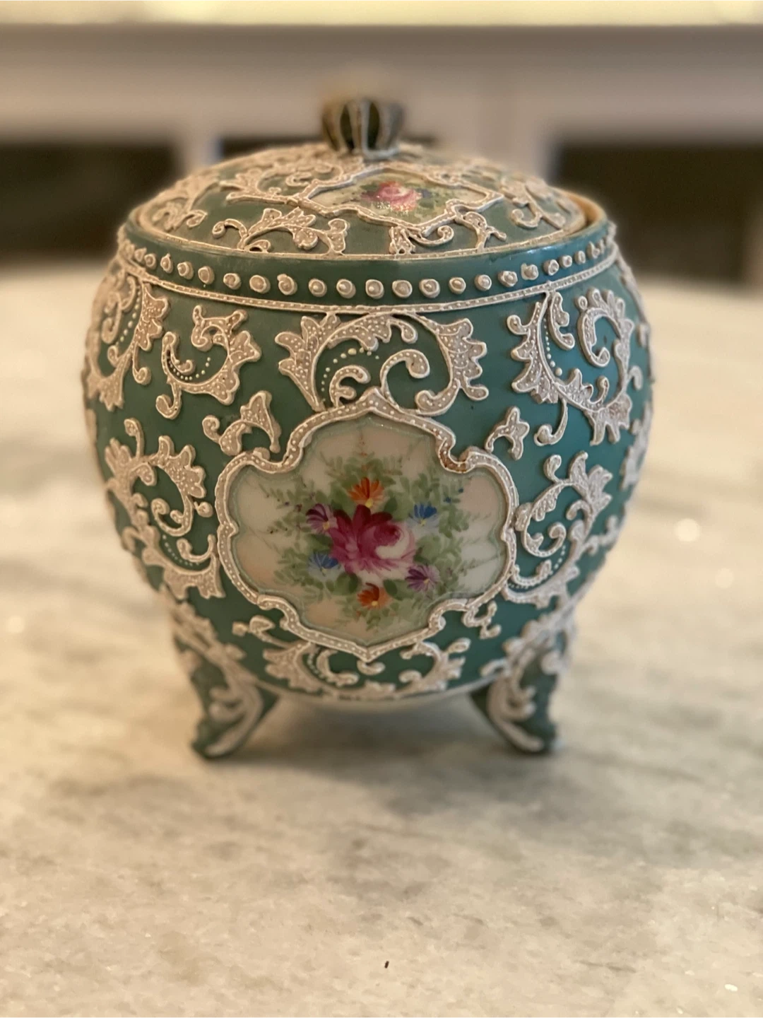Selling a lovely vintage decorative vessel with intricate floral designs.