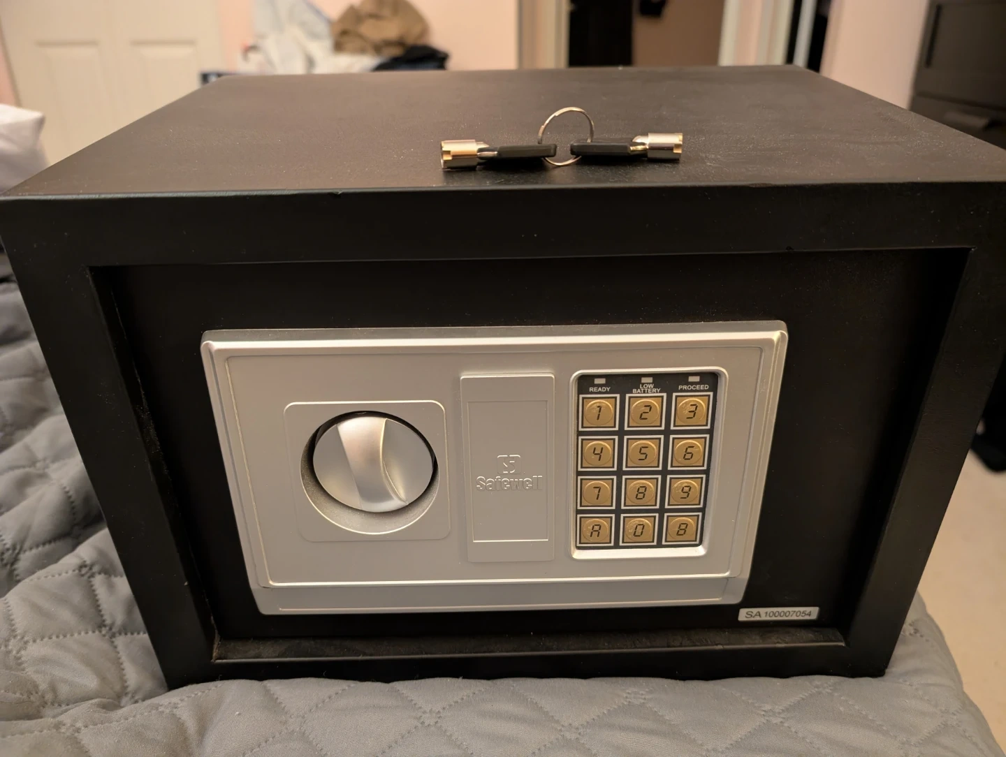 Selling a Safewell safe box in black. It's in good condition and measures approximately 11 inches in height and 14 inches in width. Comes with keys as well
