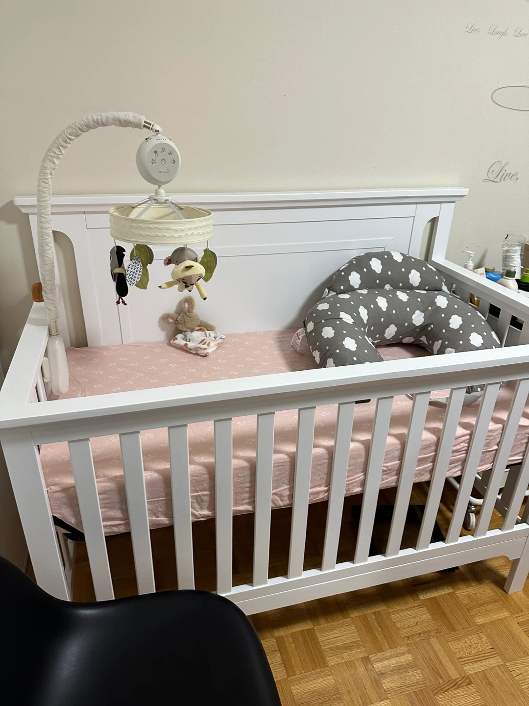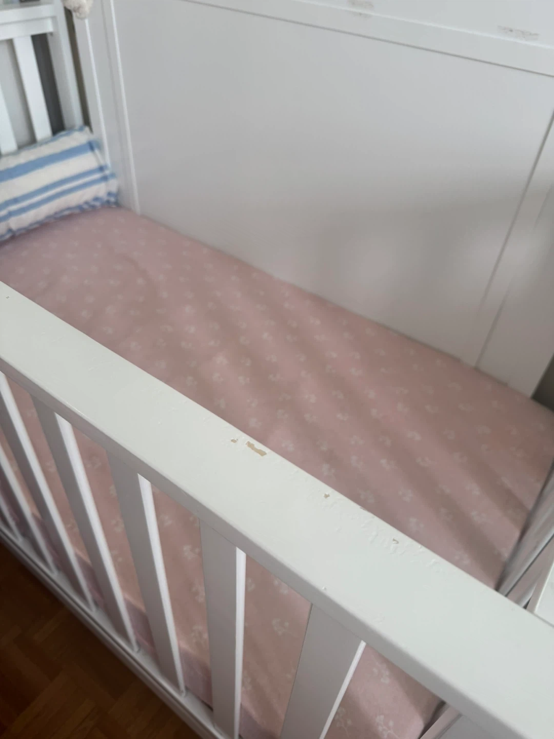 Selling a white baby crib in good condition. It's perfect for your little one's nursery! There are some minor signs of use, but overall it's very sturdy and clean. It comes as is, ready for a new home
