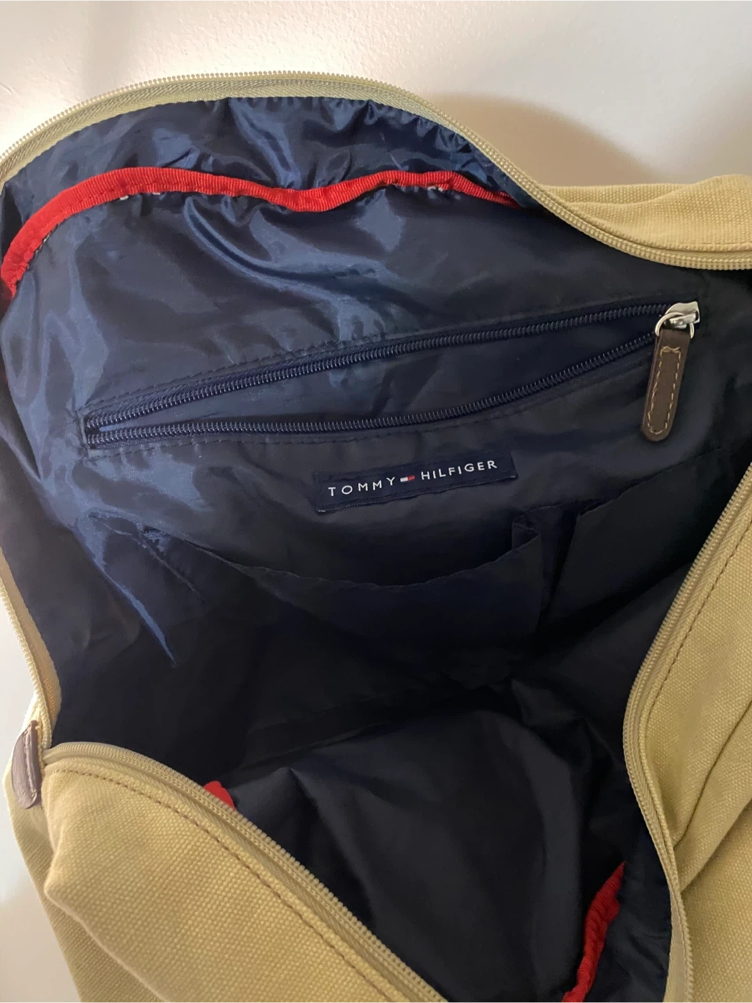 Tommy Hilfiger duffle bag in a lovely beige colour! It features a navy blue interior lining and red accents. The bag has a zippered closure and sturdy handles, perfect for travel or everyday use. The classic Tommy Hilfiger design adds a touch of style!