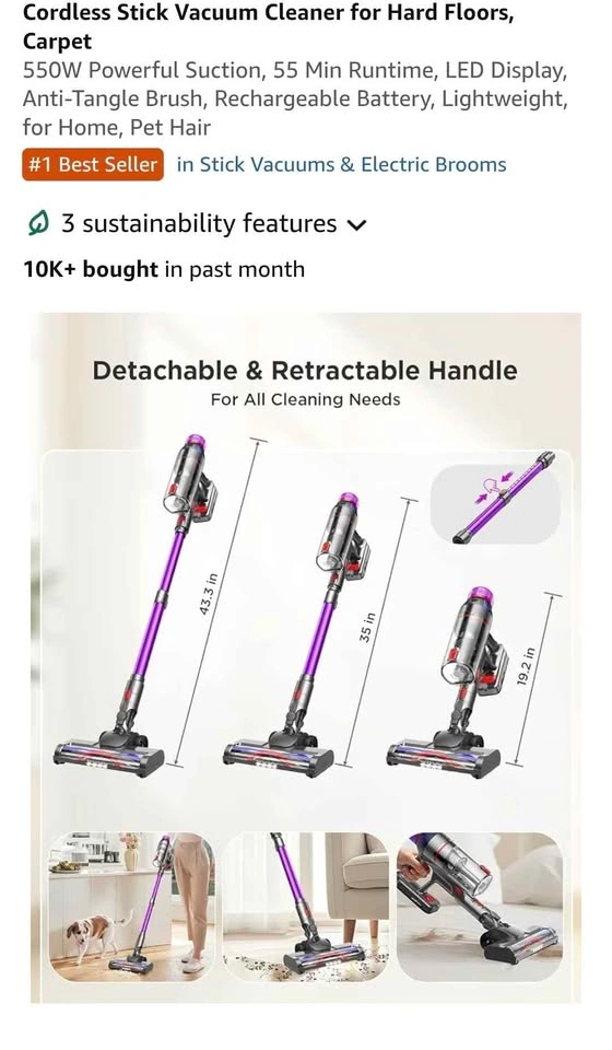 Selling cordless stick vacuum cleaner, 550W strong suction, LED display, 55-min runtime, anti-tangle brush. Super lightweight and works great on floors, carpet, and pet hair.