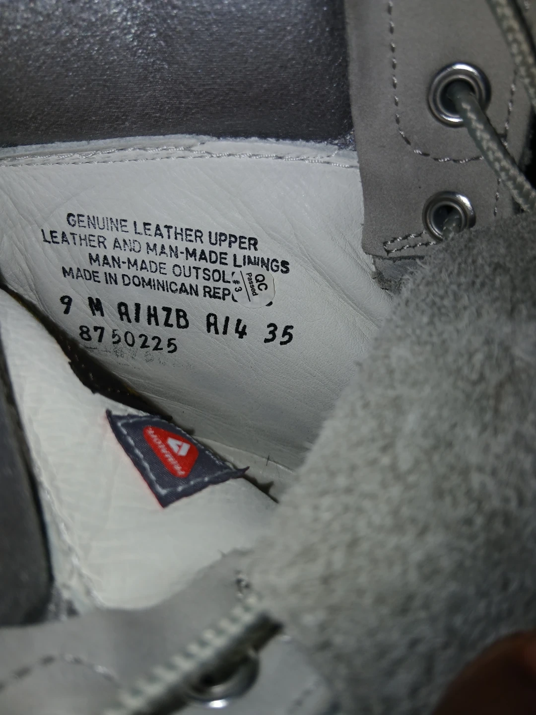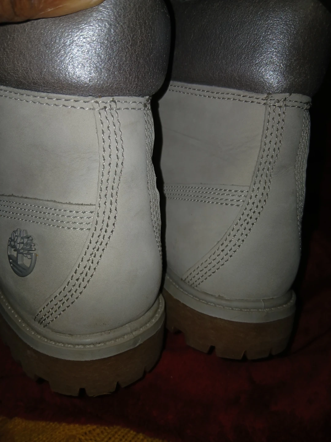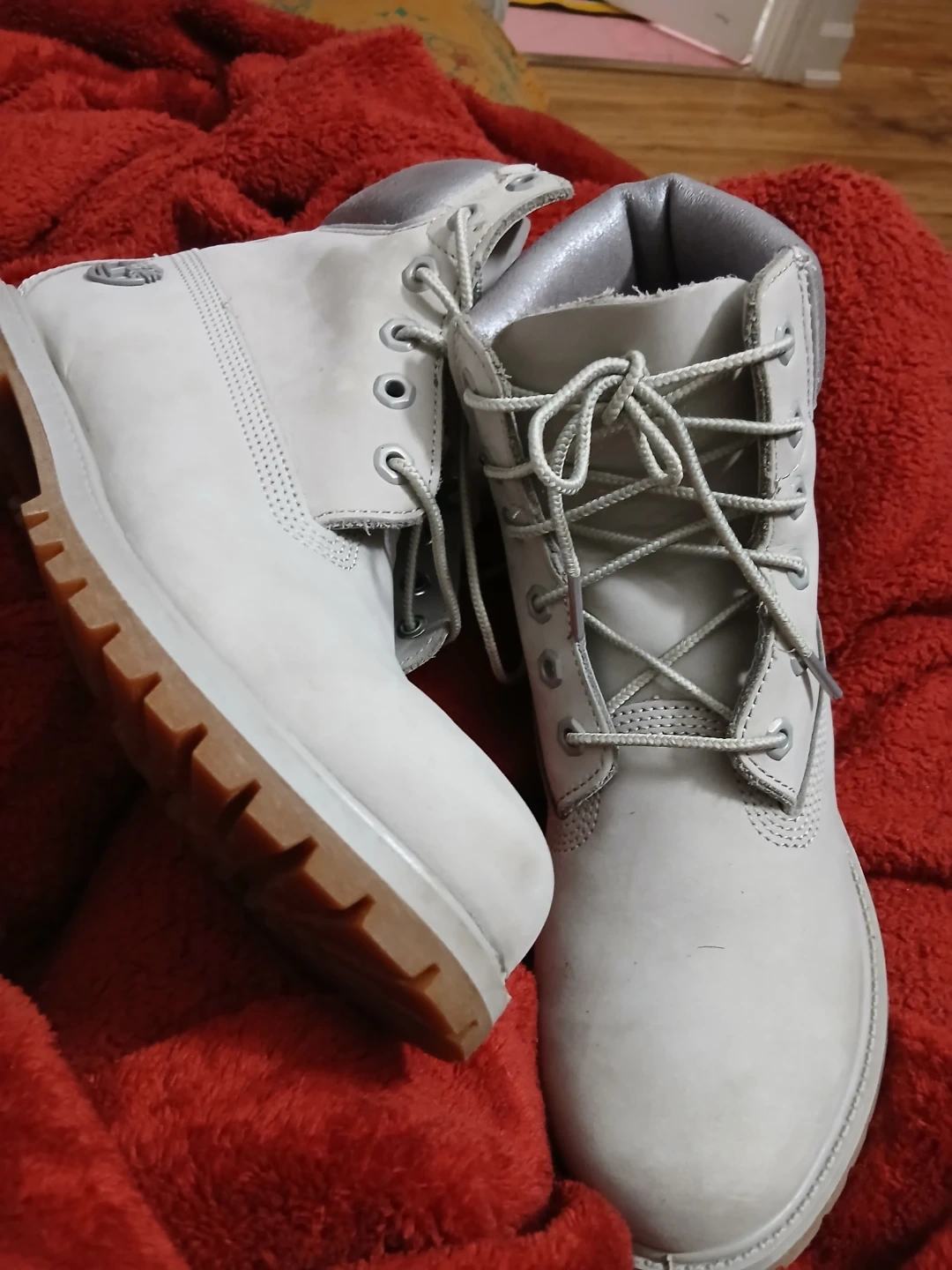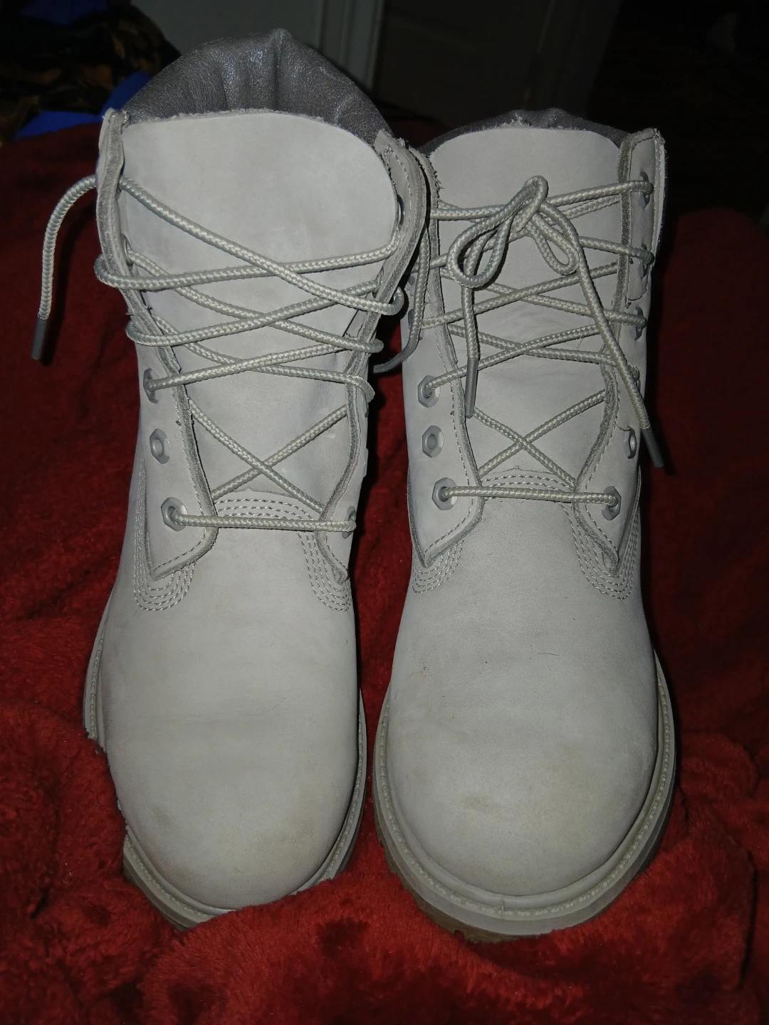 Here are some Timberland boots in a neutral colour! Light gray.. They are a size 9M and have a genuine leather upper with man-made linings and outsoles