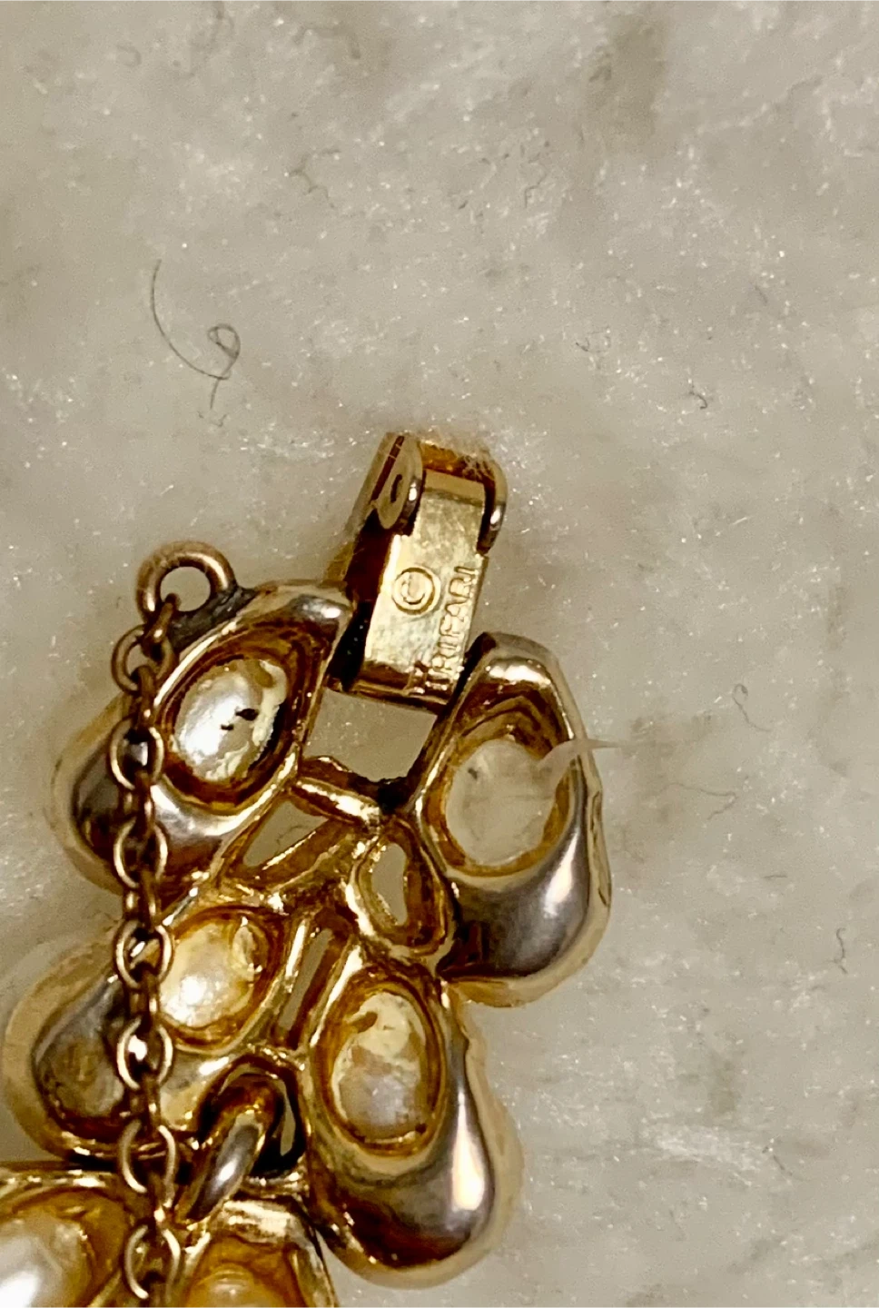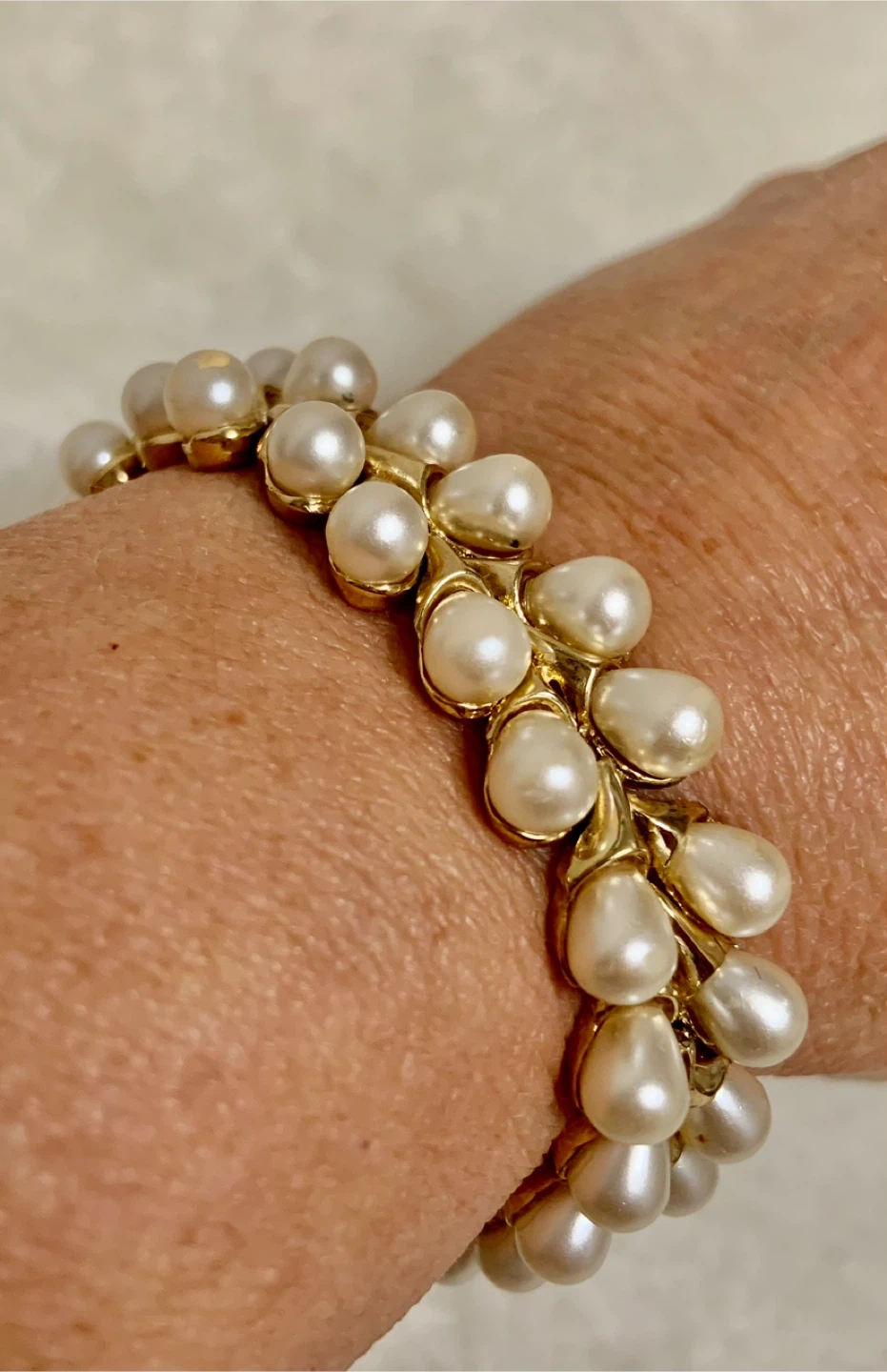 Selling a lovely “Crown Trafari” vintage bracelet featuring gold-tone metal and faux pearls.