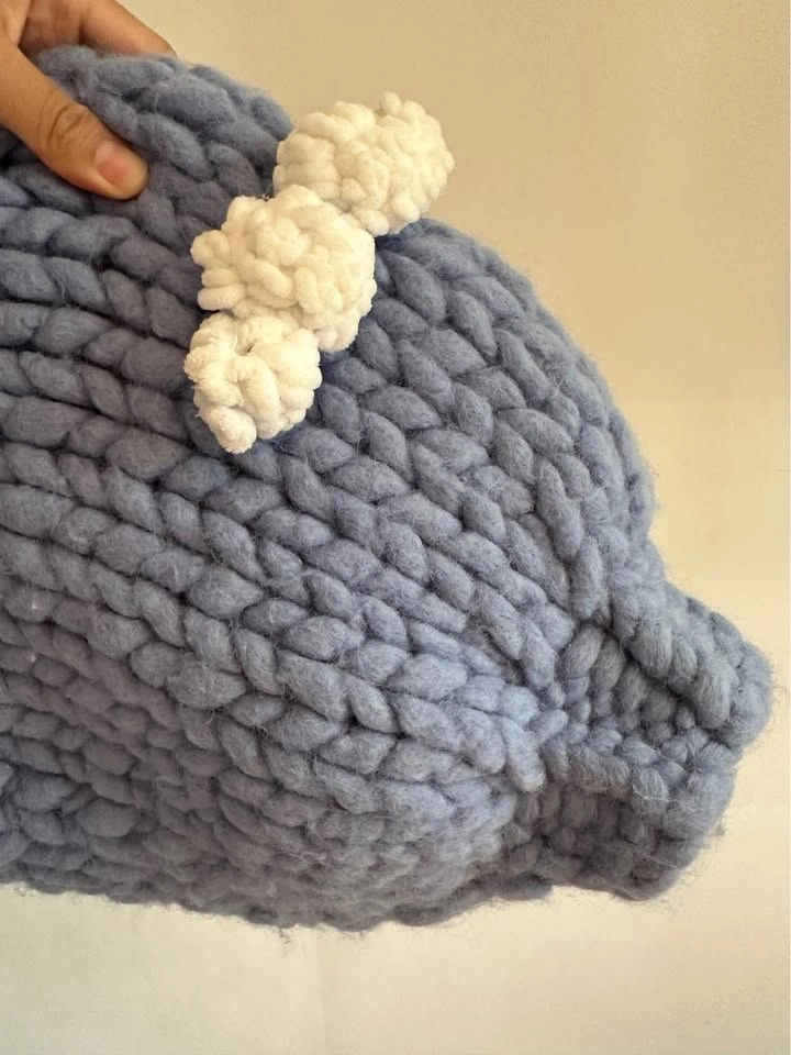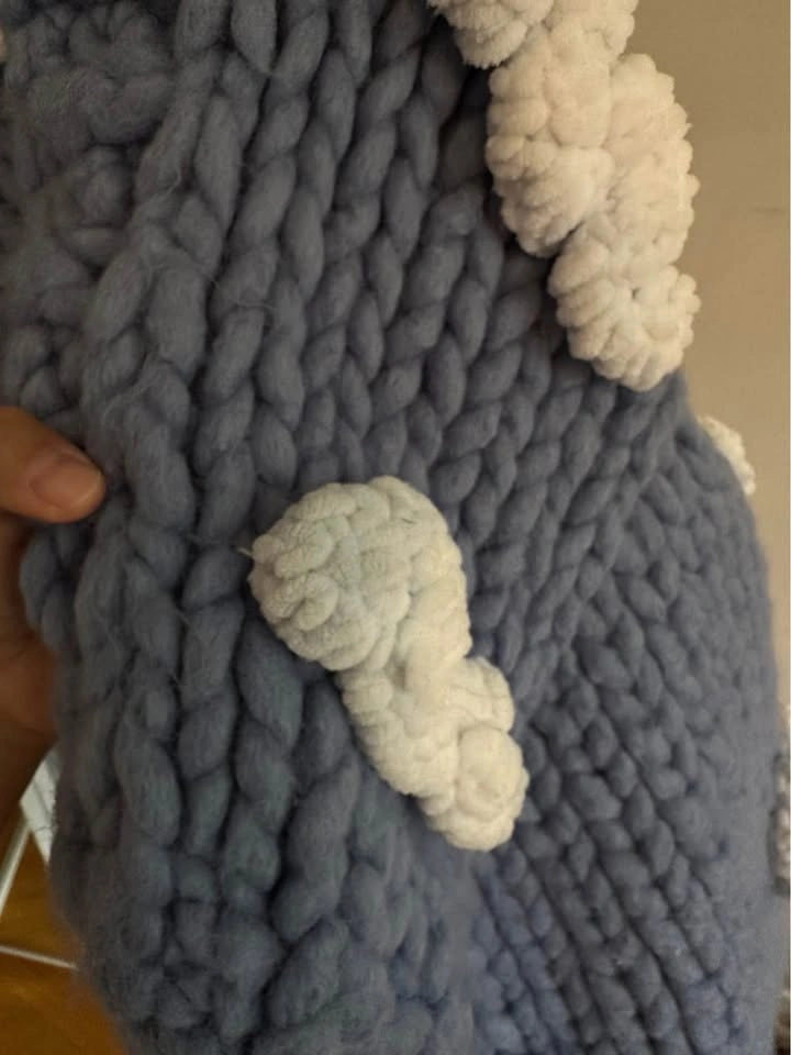 Some of the clouds have dye transfer from the blue wool but it is not too noticeable from far away. Please see photos for the best details and ask any questions.
