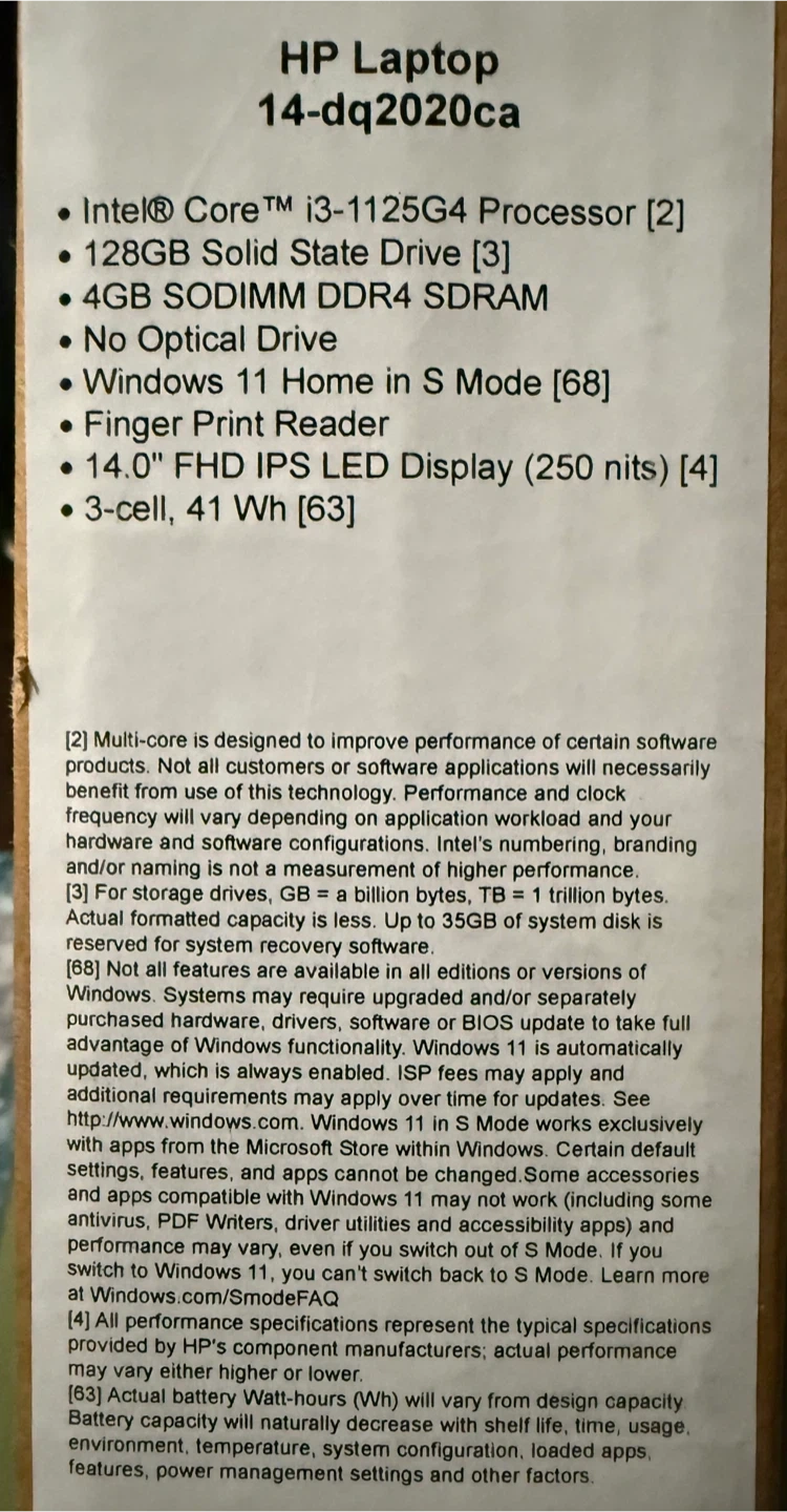 Selling an HP 14-dq2020ca laptop in mineral silver! It comes with the box and includes the 45 W Smart AC power adapter and setup poster.