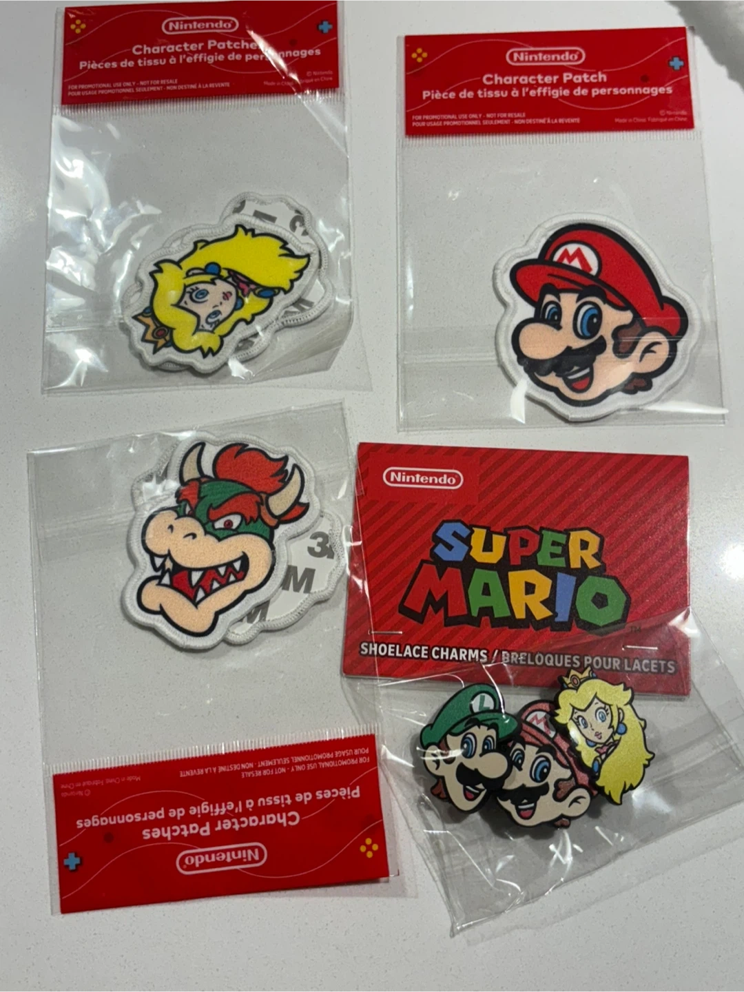 Selling a set of Nintendo character patches and shoelace charms! These are perfect for adding a bit of fun to your clothes or shoes. The set includes patches of Mario characters and shoelace charms featuring Mario, Luigi, and Princess Peach.