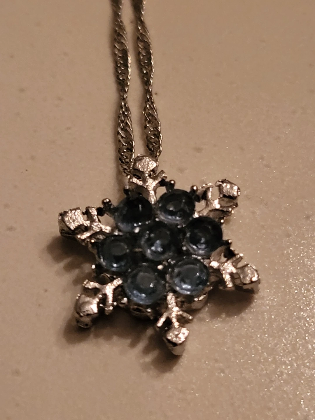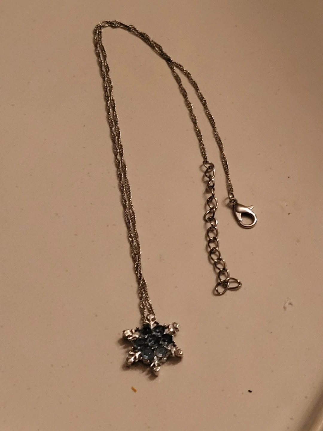 Buy & SellSnowflake Pendant NecklaceSnowflake Pendant Necklace$9A lovely snowflake pendant necklace! The pendant has blue stones and a silver-tone finish. The shiny silver tone chain is adjustable. 18" to 20"ConditionLike newSize18" - 20"0 chats·0 favorites·5 viewsSELLERverifiedTammyLavalee1348 reviewsWHERE TO MEETWorthington