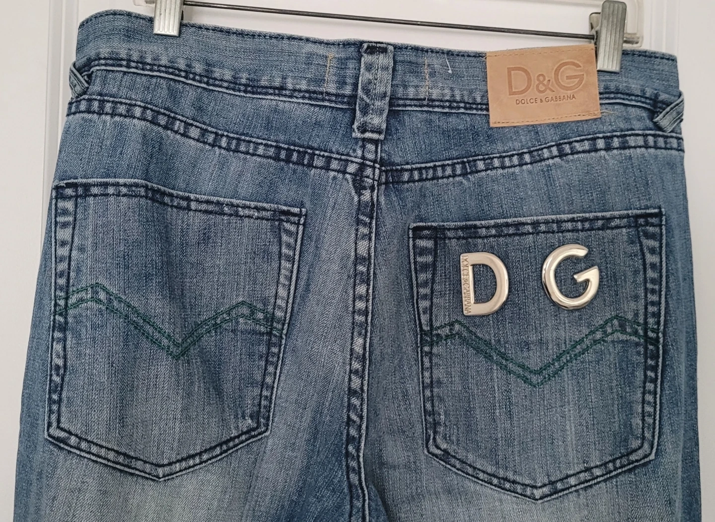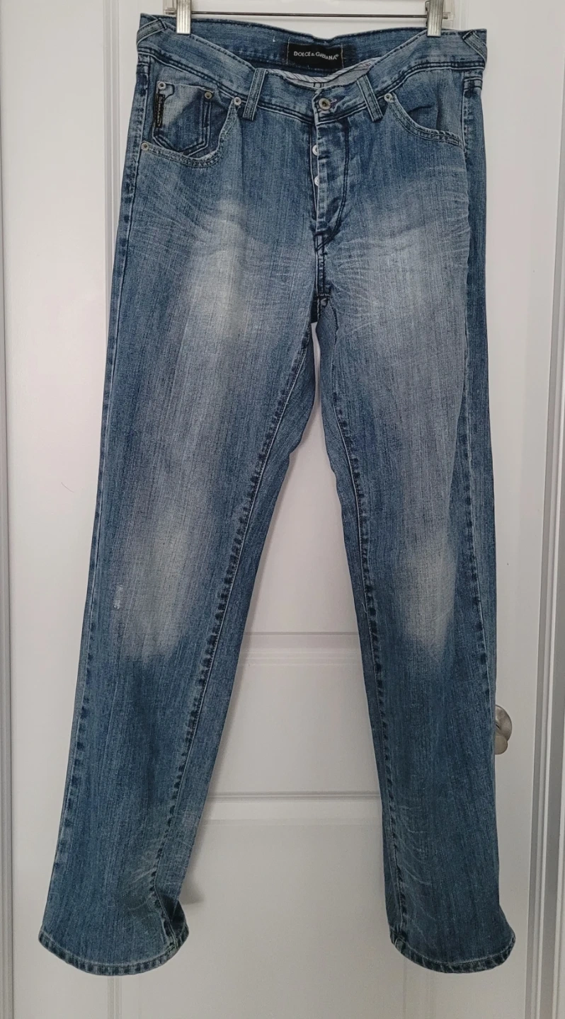 Selling a pair of man's Dolce & Gabbana jeans. They feature the D&G logo on the back pocket and a leather patch on the waistband. The jeans are in new-like condition and have a classic denim wash. Perfect for adding a touch of designer style to your wardrobe!