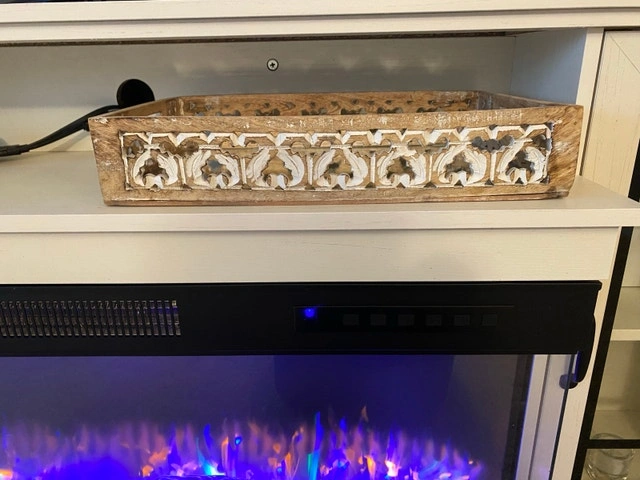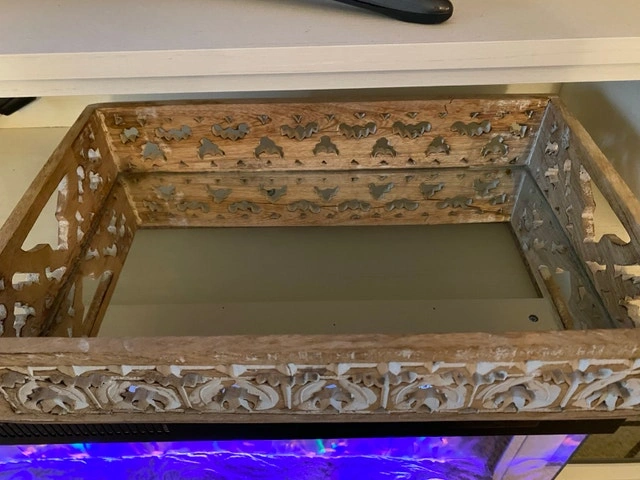 Enhance your home decor with this intricately designed wooden tray, perfect for adding a touch of rustic elegance to any room. The tray features beautiful carved detailing around the edges and a mirrored bottom, adding a touch of sophistication. It's in good condition with a slight crack in the one corner and ready to be a stylish addition to your living space. This decorative tray is great for serving or decoration. It is in used but good condition.