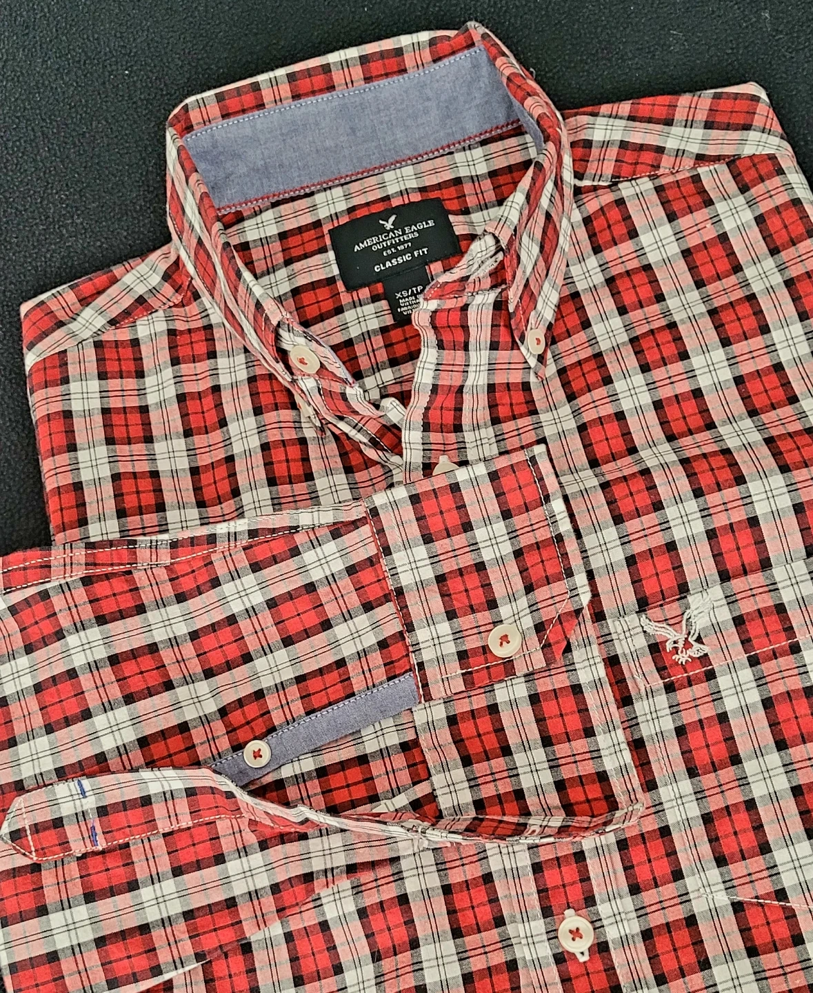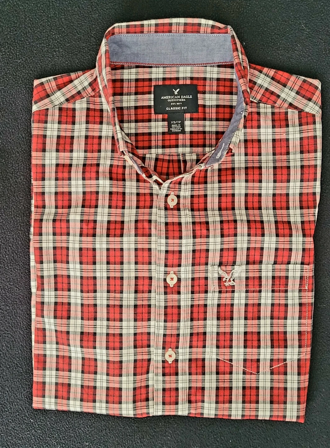 This is a classic fit, button-down shirt from American Eagle Outfitters. It's a size S in new-like condition, and features a red and white plaid pattern. Great for a casual look!