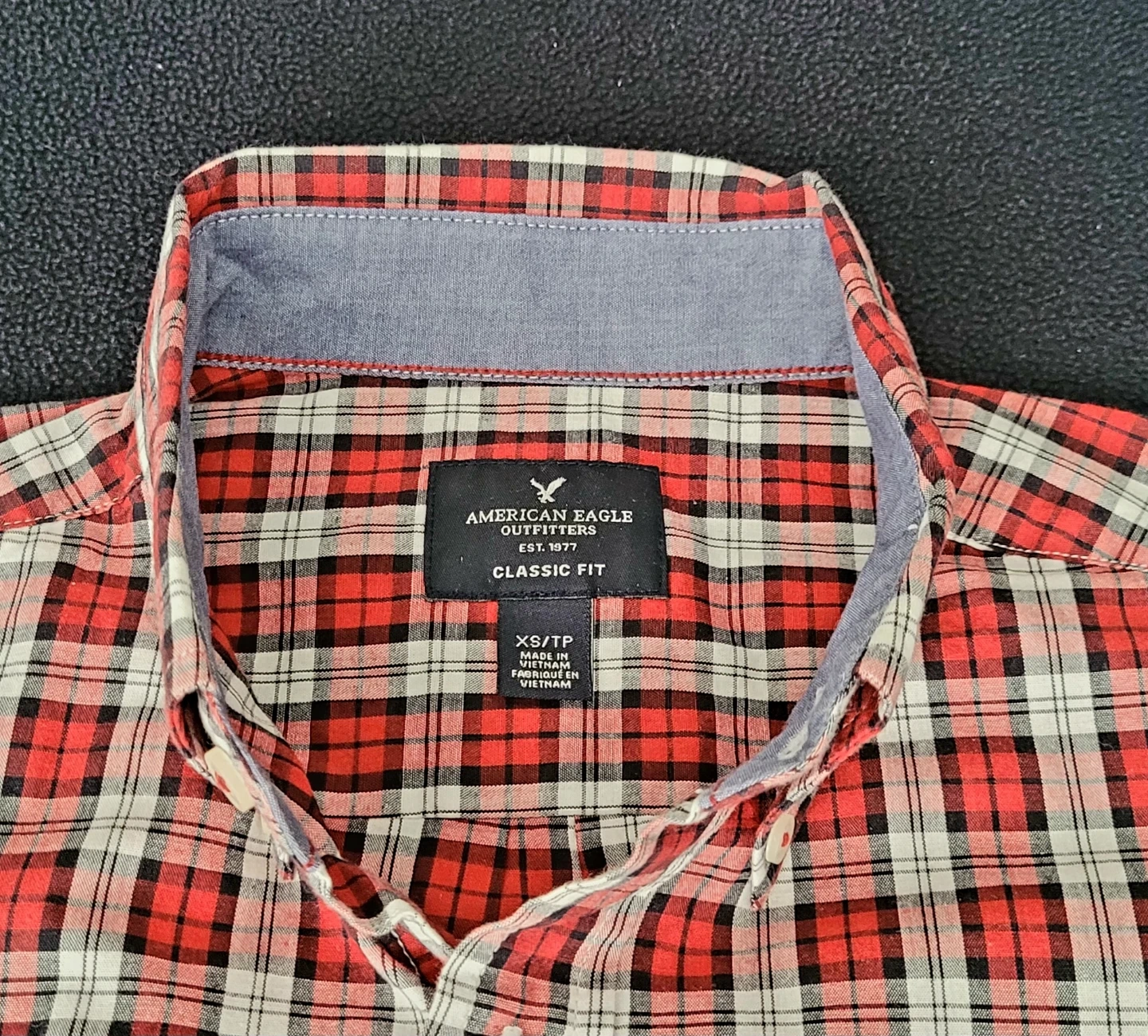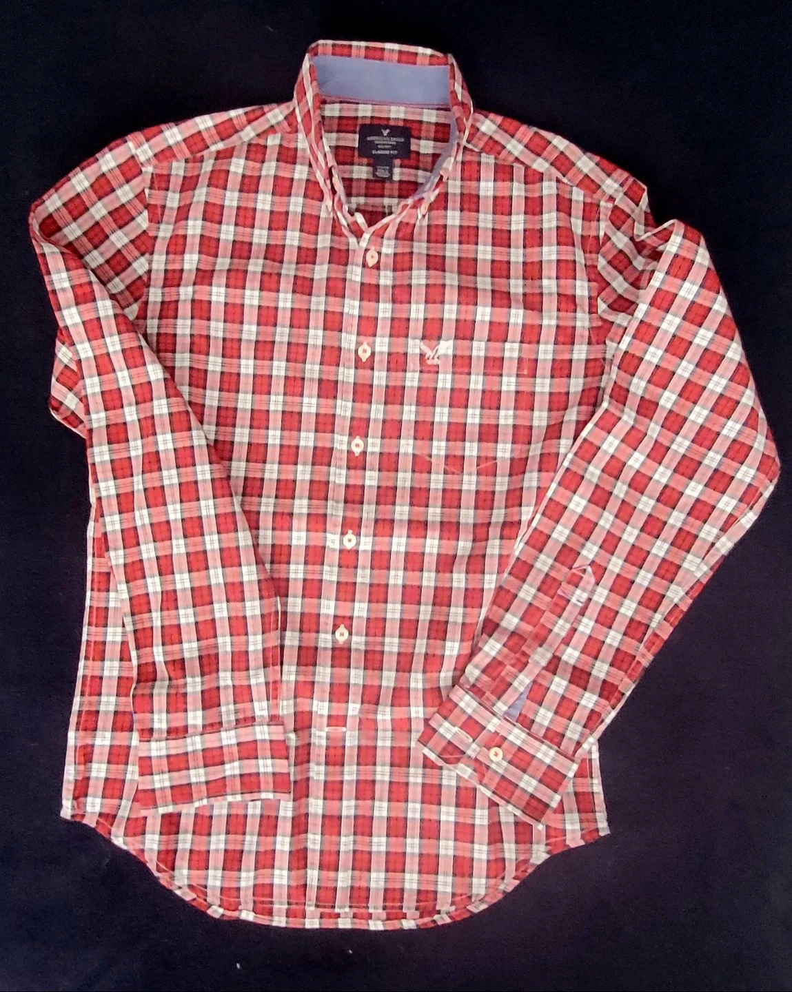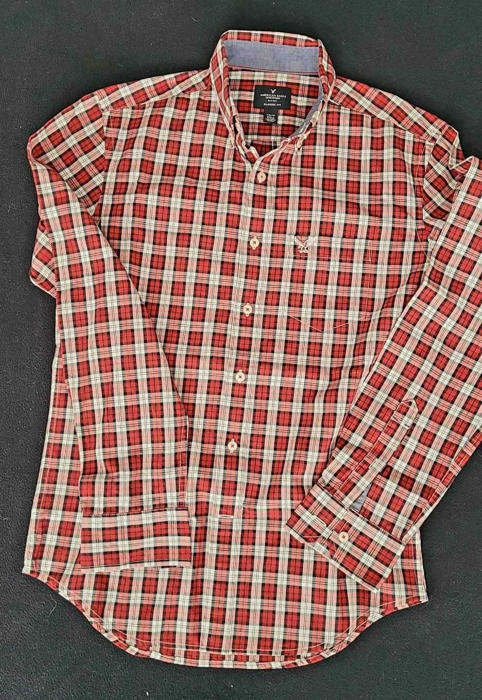 This is a classic fit, button-down shirt from American Eagle Outfitters. It's a size S in new-like condition, and features a red and white plaid pattern. Great for a casual look!