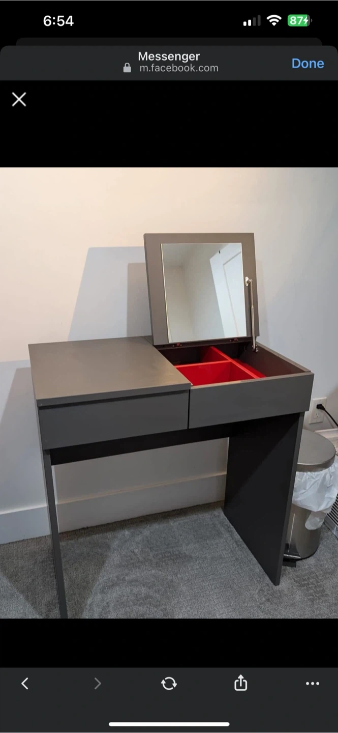 Selling a vanity desk in grey! It has a mirror and storage compartments inside. Can shut the mirror and just turn it into a desk for studying very versatile. It's a great piece for any bedroom or dressing area to keep your makeup and accessories organized