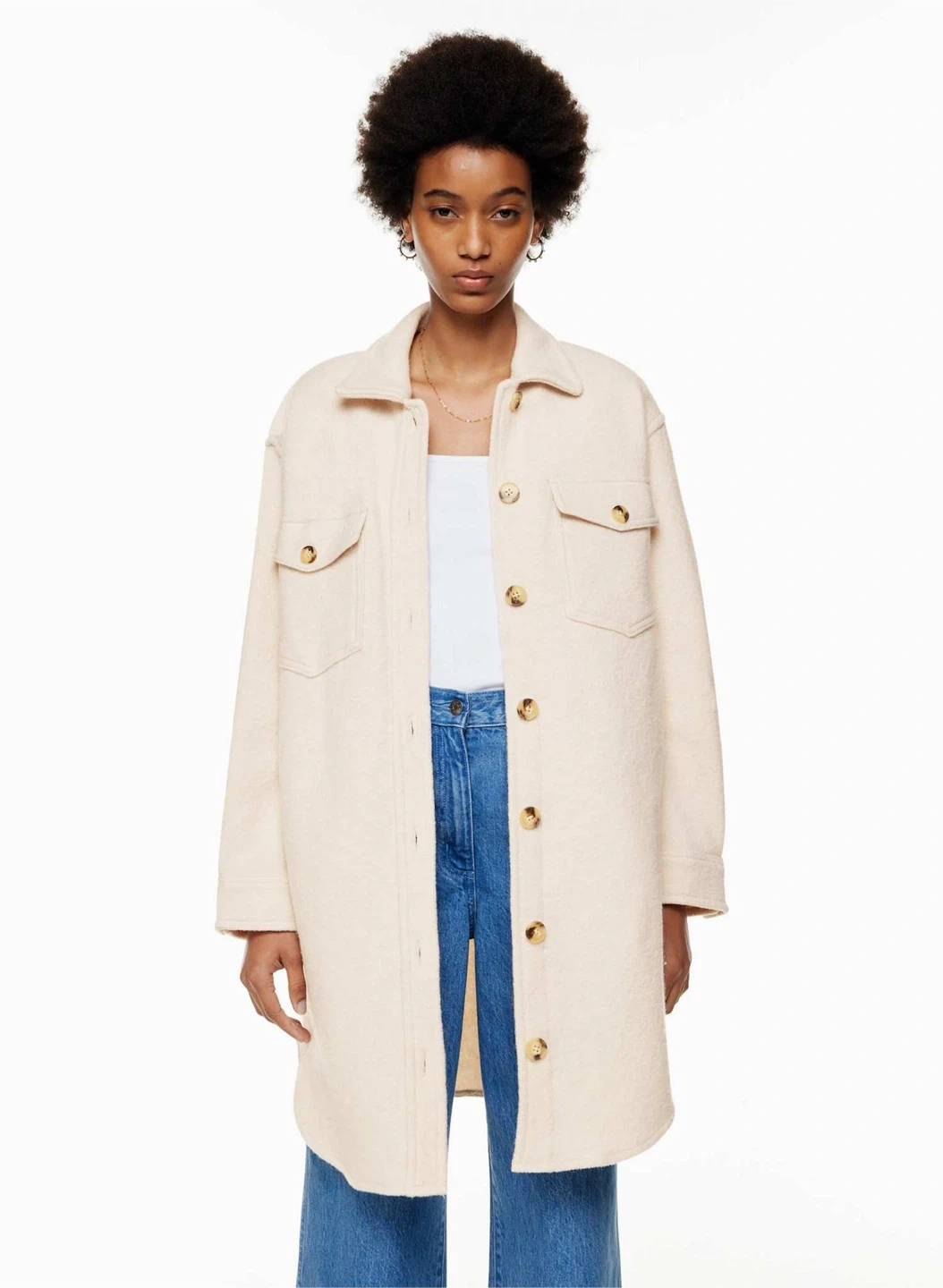 Keep your jacket on. Inside, outside — everywhere. A Wilfred Free classic beloved for its relaxed silhouette and all-season versatility, The Ganna™ delivers the relaxed silhouette of a shirt with the warmth of a jacket, transcending the typical rules of indoor/outdoor style. It's crafted with dropped shoulders, patch pockets and a rounded hem for throw-over-anything ease. This version has a longer inseam and is expertly tailored with boiled merino wool that's plush, dense and textural.