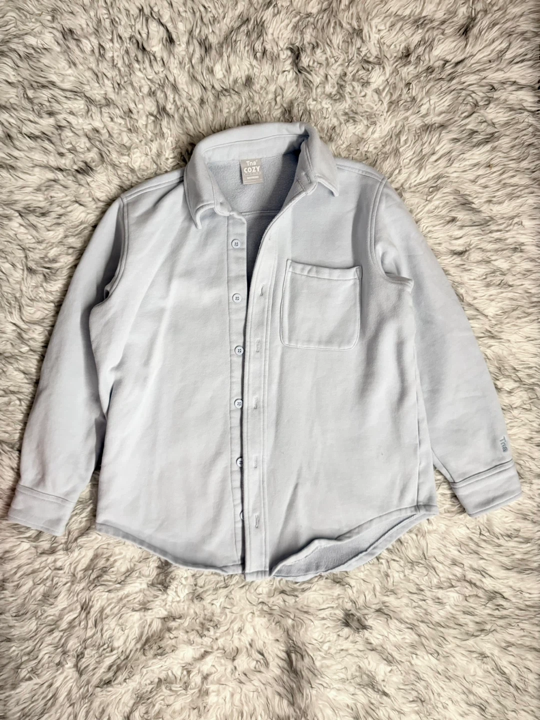 How about some cozy layers? This is a long-sleeve button-up shirt with dropped shoulders and a rounded hem.