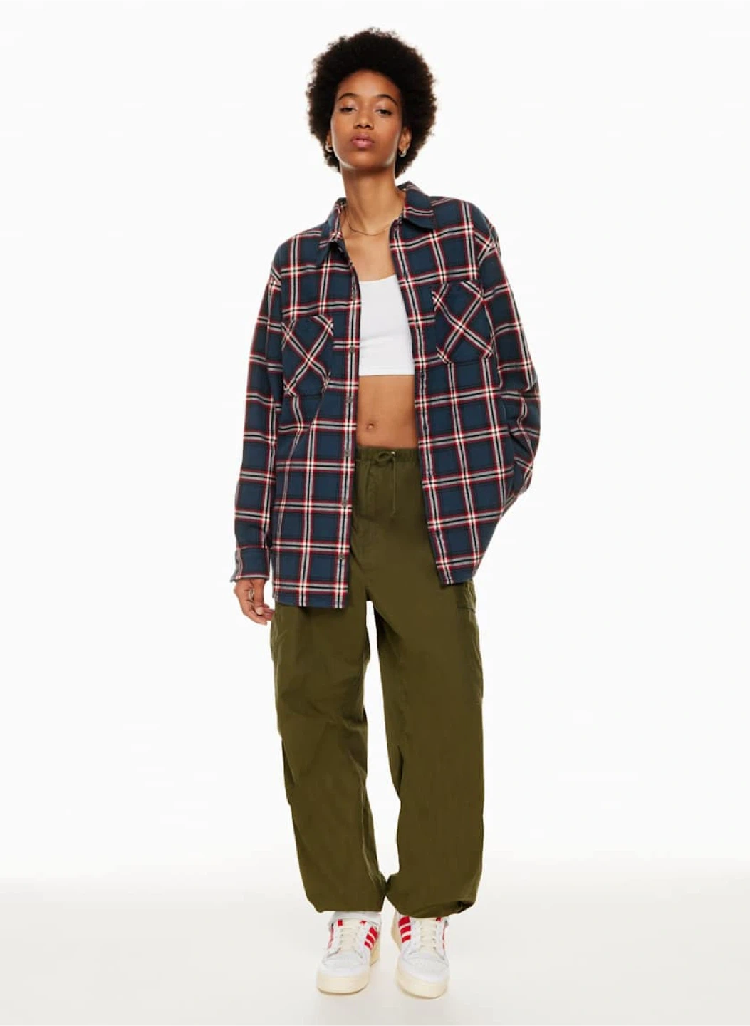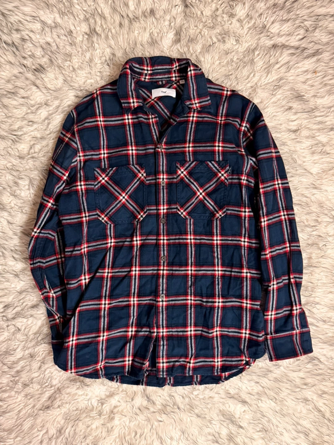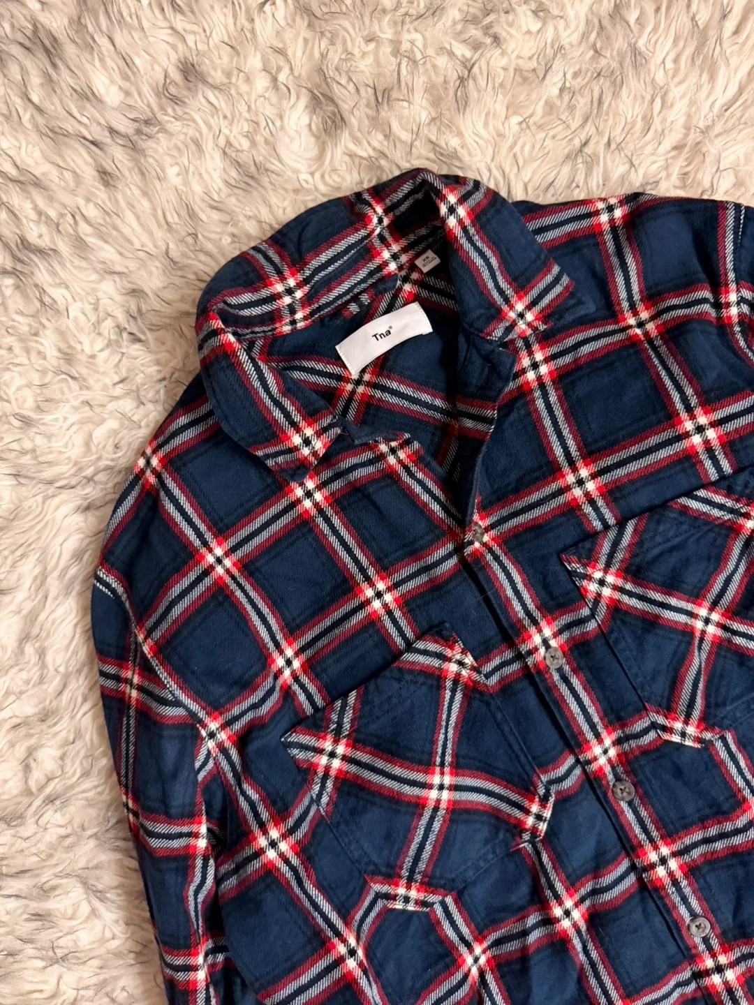 That wood won't chop itself. This is an oversized plaid button-up with patch pockets and a rounded hem. It's cut from Flannel — cozy, soft-brushed fabric made with 100% organic cotton. (Thick material, almost a shacket). Worn a few times. Like new. Size XS (Oversized).