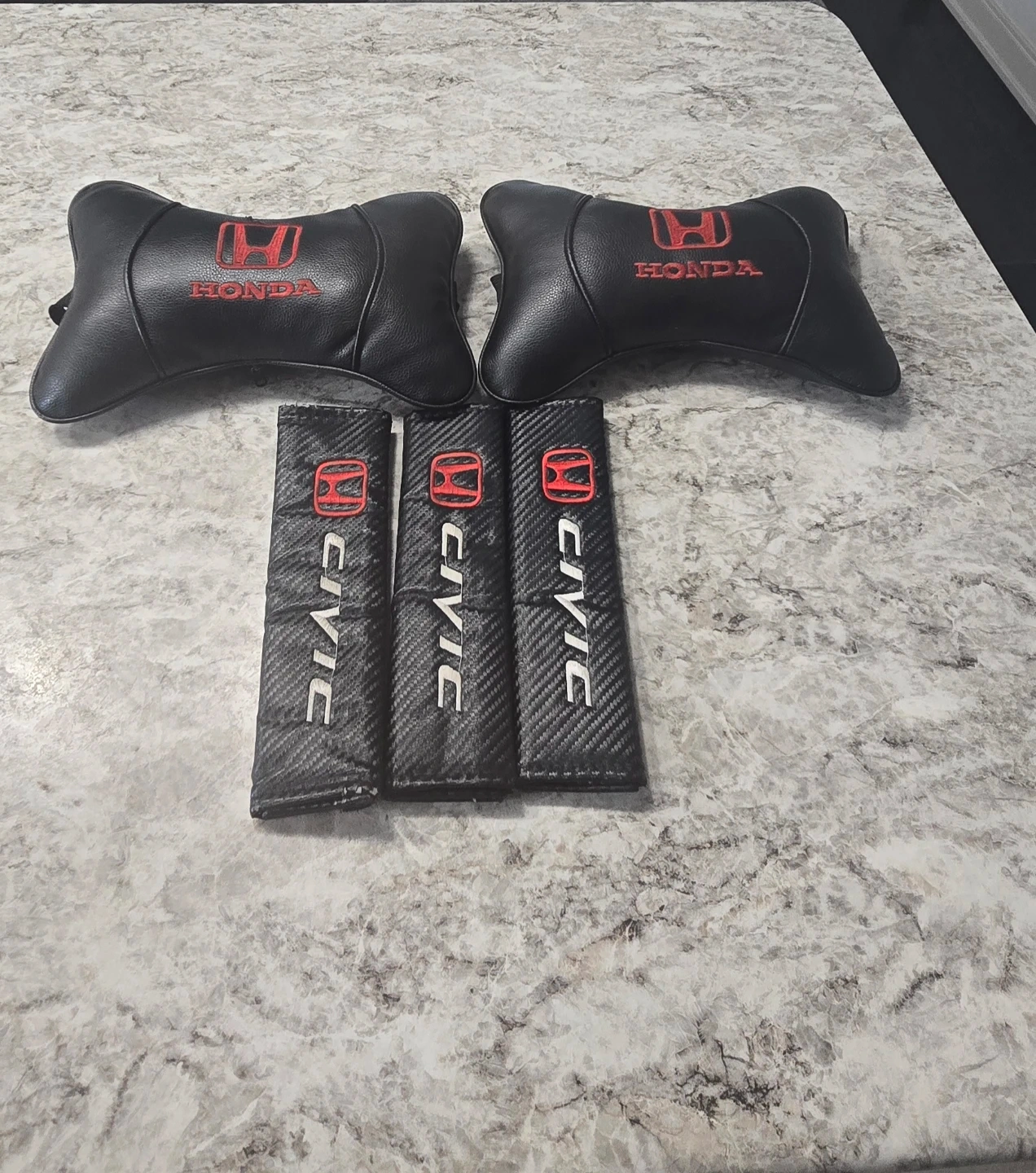 Selling a set of Honda Civic car accessories! This includes two headrest pillows and three seatbelt covers, all in black with red Honda logos and 'CIVIC' text. Great for adding a sporty touch to your ride!