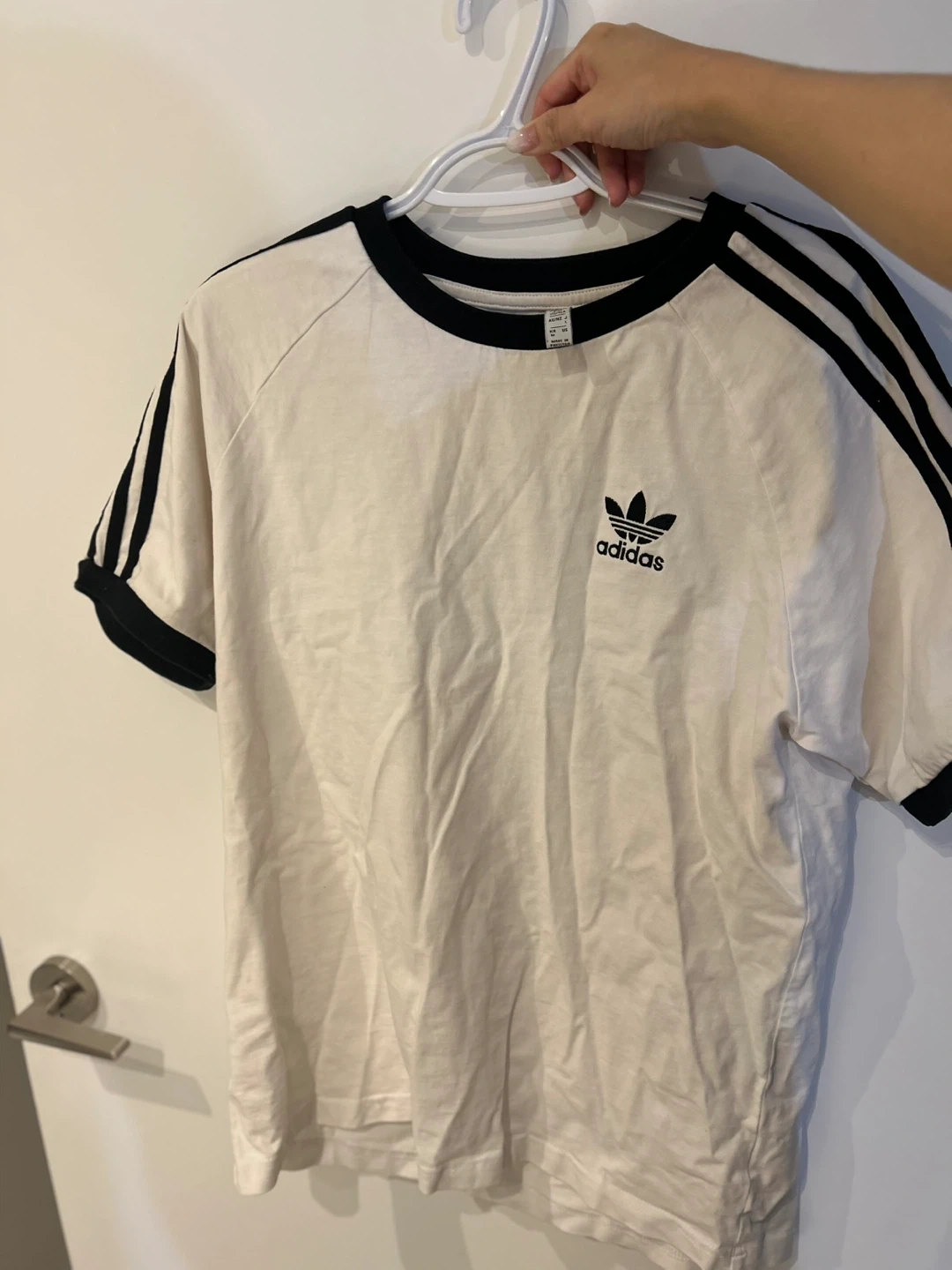 Selling a cream and black Adidas t-shirt. It has the classic three stripes on the sleeves and the Adidas logo on the chest. Perfect for casual wear!