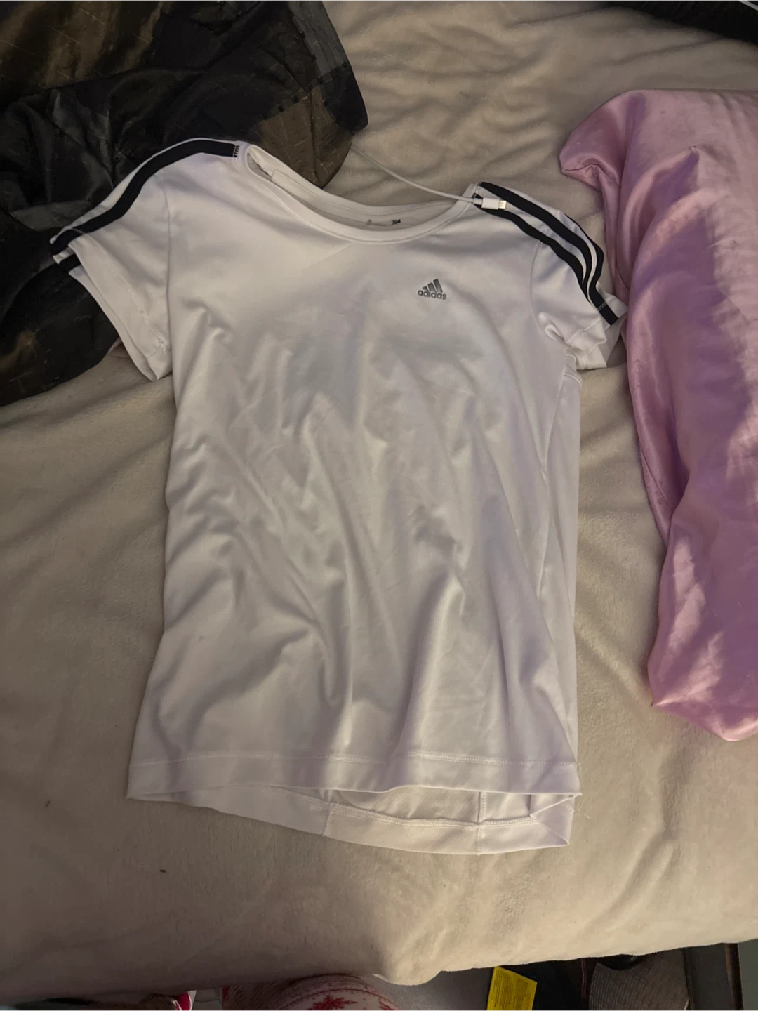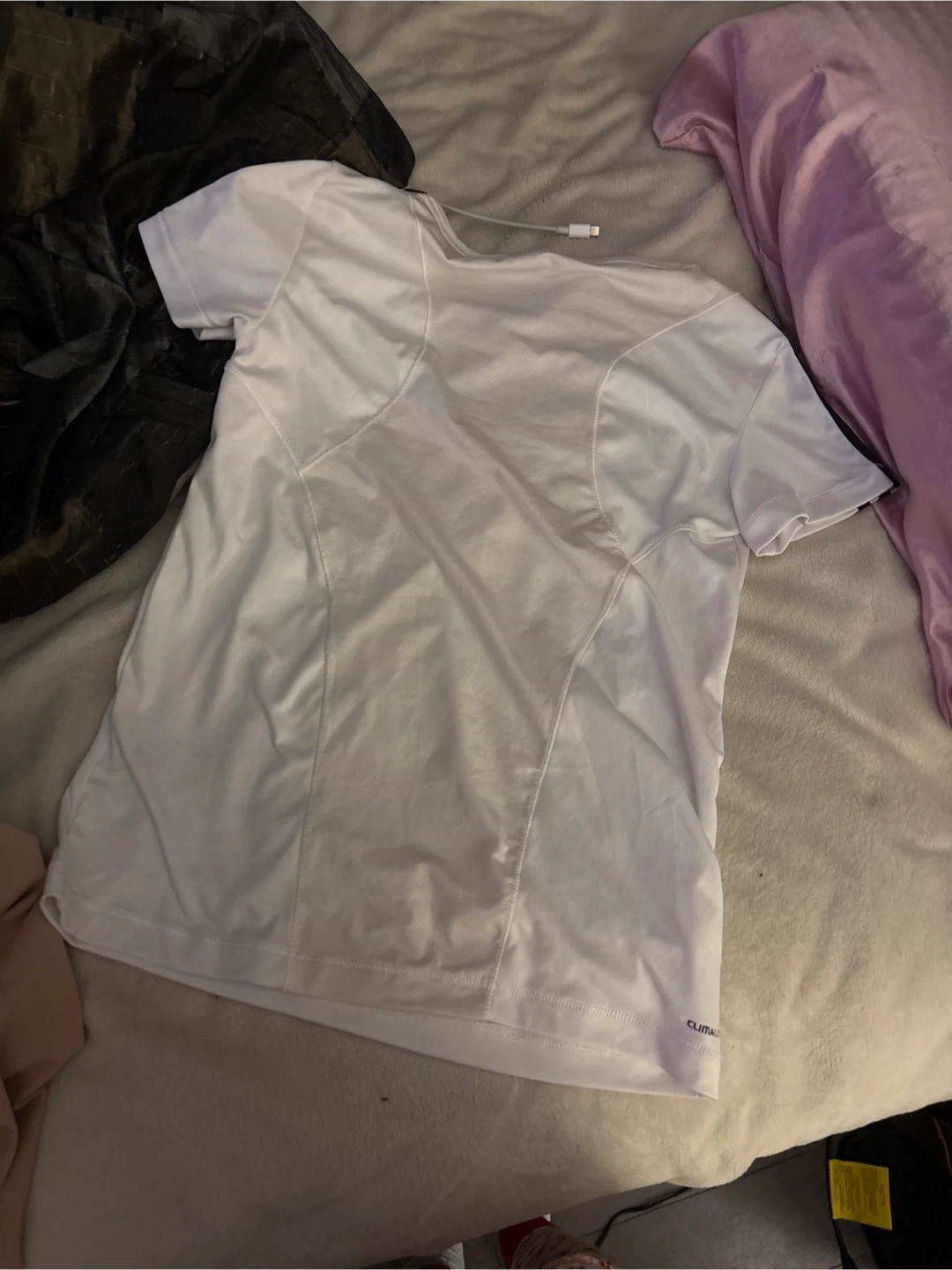 Selling a white Adidas ClimaLite t-shirt! It's in great condition and perfect for workouts or casual wear. Features the classic three-stripe design on the sleeves. Been worn twice,