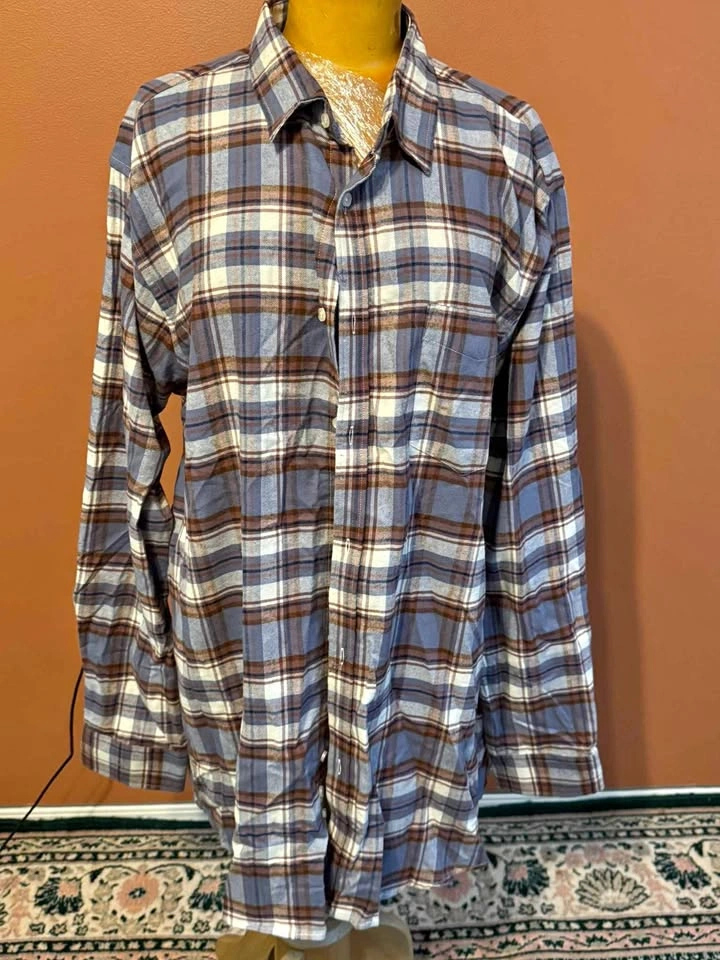 Cozy and stylish men’s flannel shirt in size 2XLT — perfect for fall and winter. Features a soft feel, button-down front, and classic plaid pattern in blue, brown, and cream.