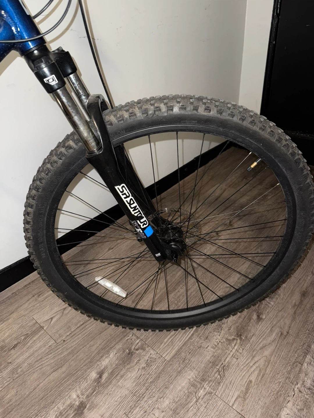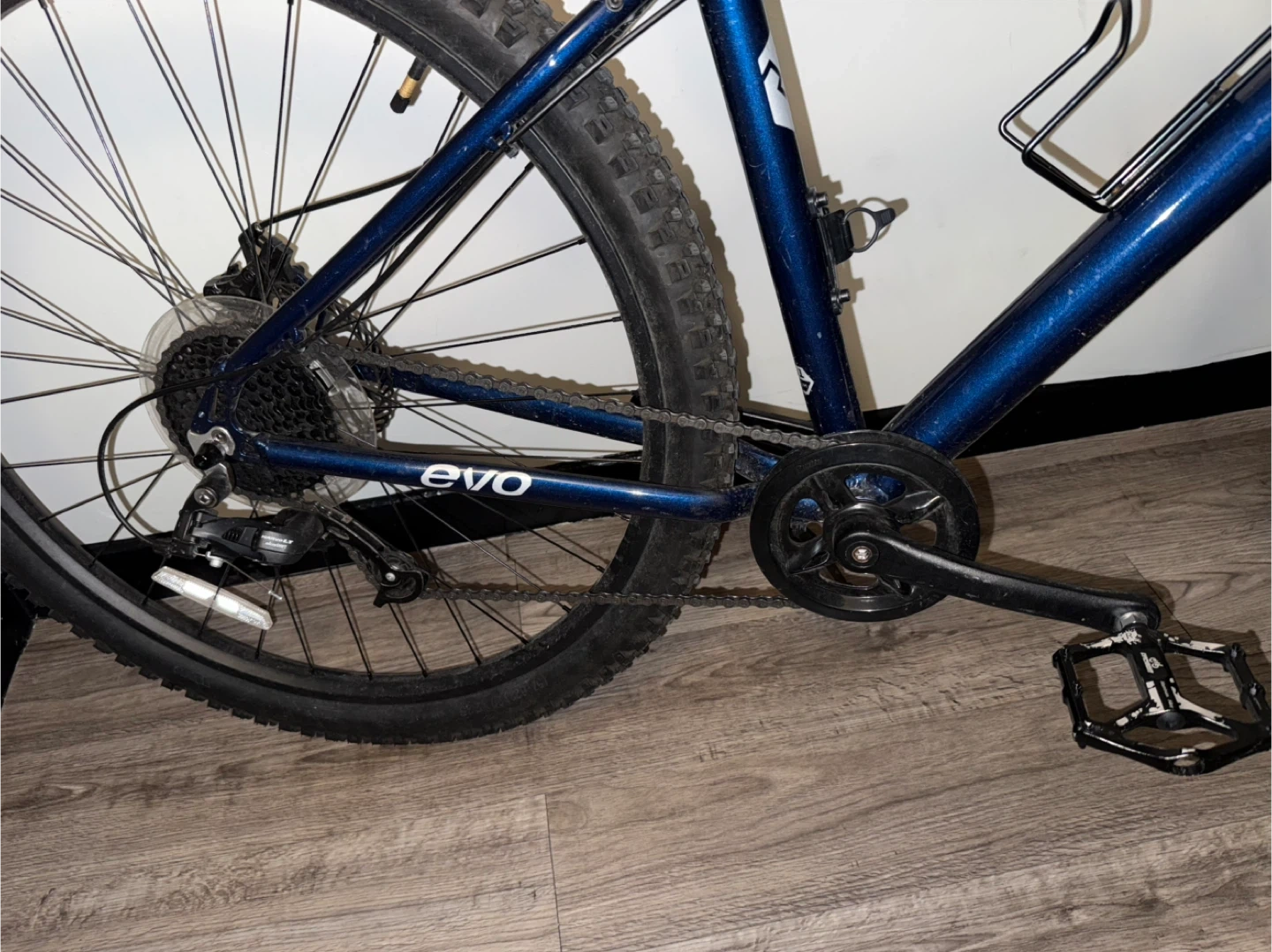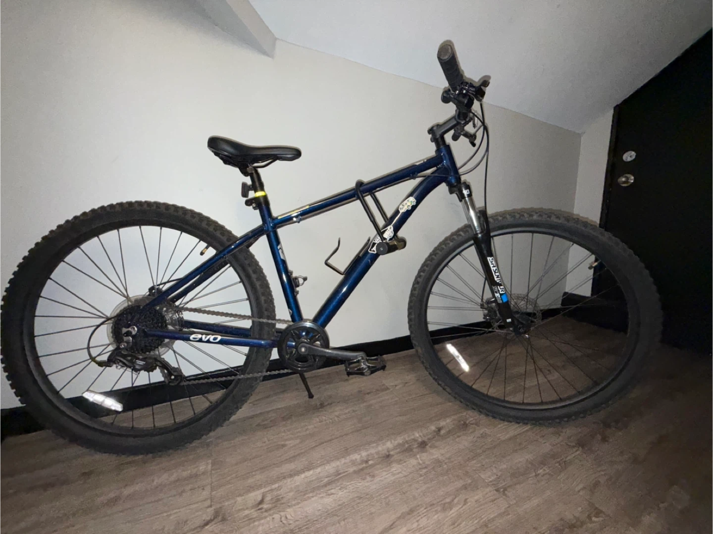 Selling a blue EVO mountain bike. It's in used condition and ready for some trails or city rides! The bike has a front suspension fork by SR Suntour. No exchanges