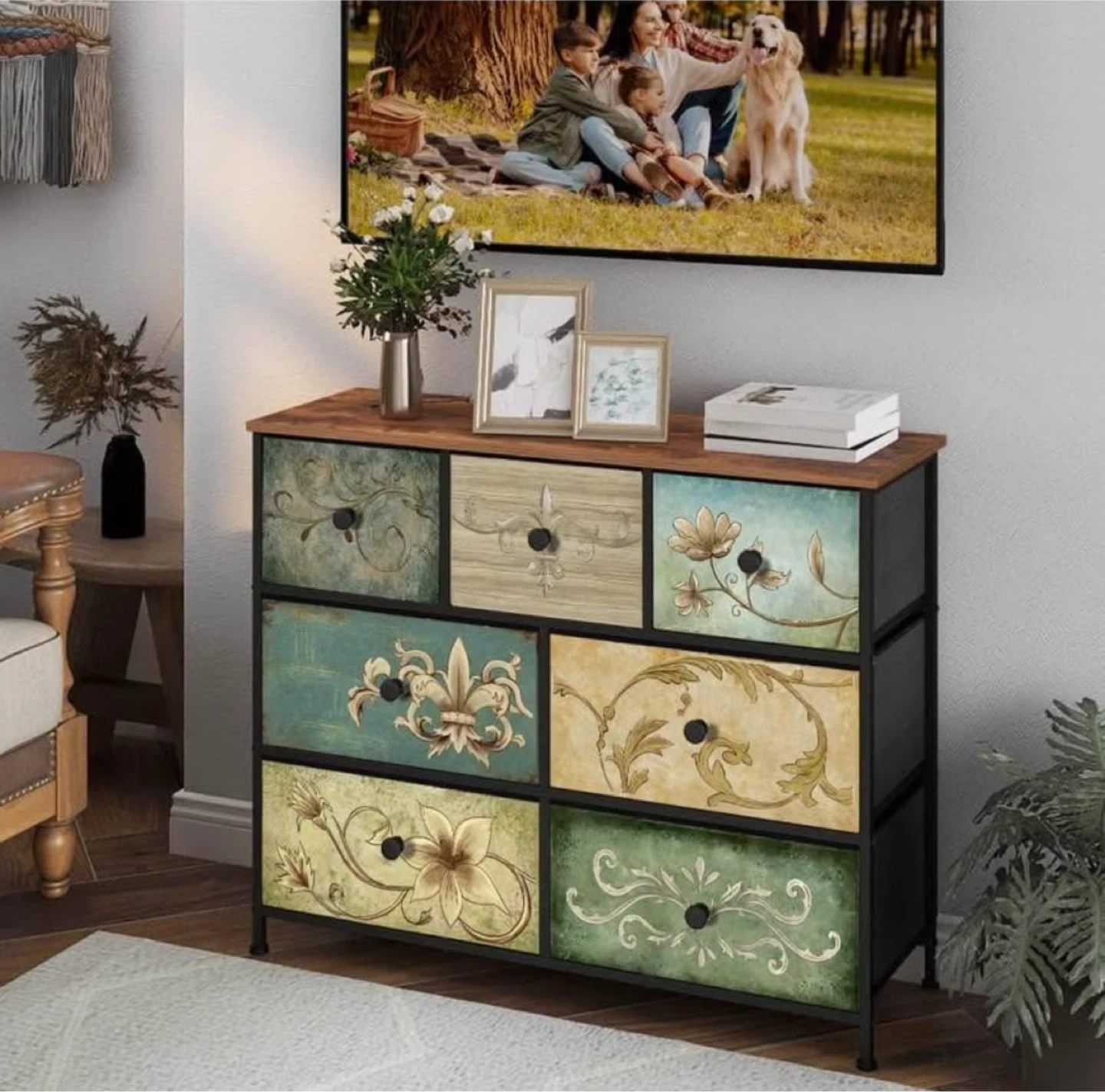 Here's a dresser with 7 drawers! It has a vintage style with floral and decorative patterns on each drawer. The dimensions are approximately 39 inches wide, 31.1 inches tall, and 11.8 inches deep. It can hold up to 50 lbs.
