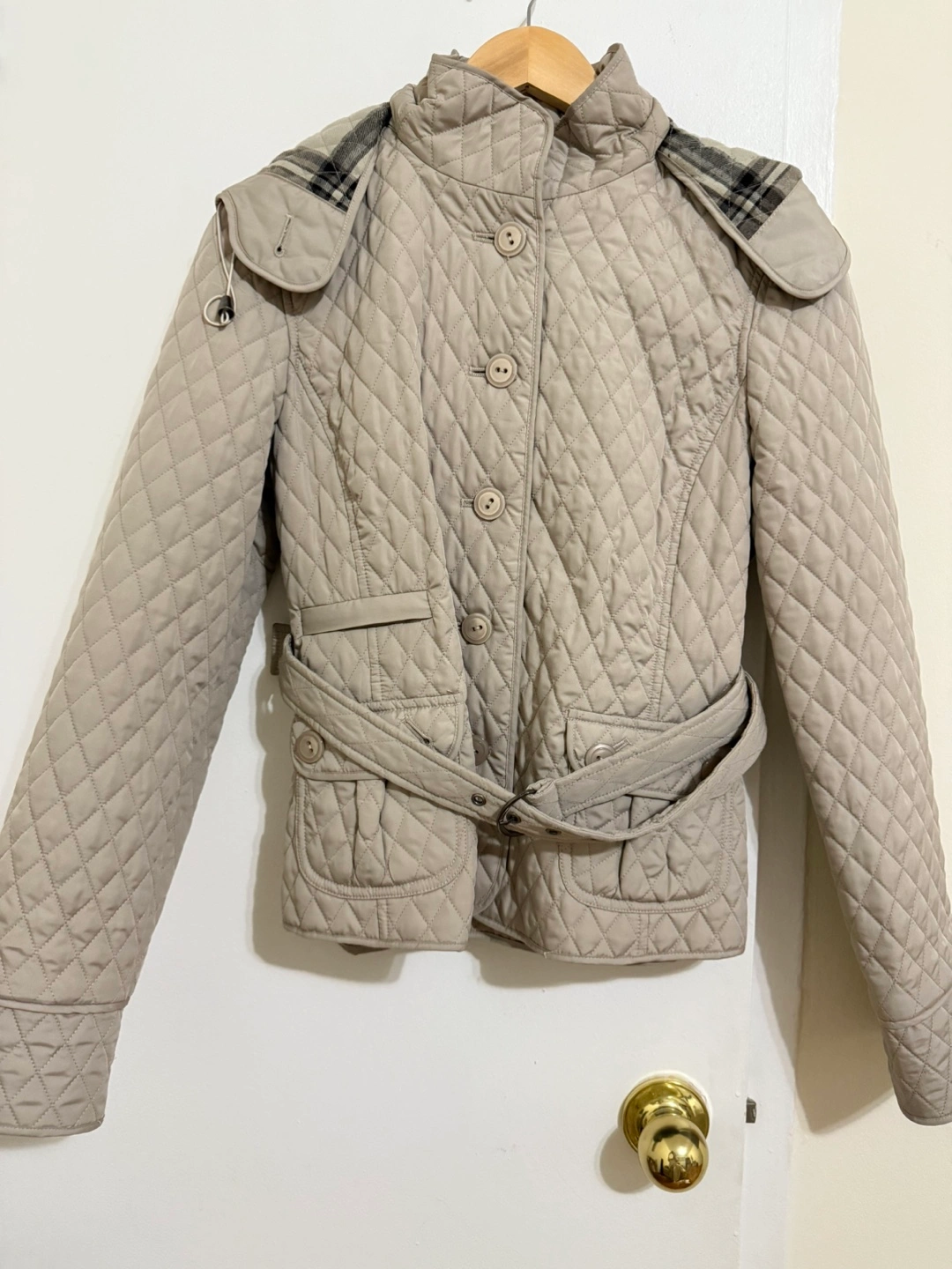 Selling a quilted jacket with hood. It features a belted waist and a classic quilted pattern. It's perfect for layering and adding a touch of sophistication to your outfit