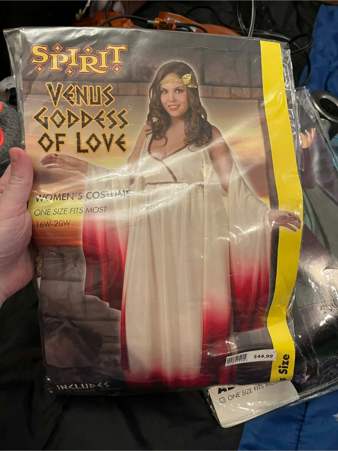 Selling a Spirit Halloween Venus Goddess of Love costume. It's a women's costume, size 16W-20W. Originally bought for $44.99! Perfect for Halloween or costume parties