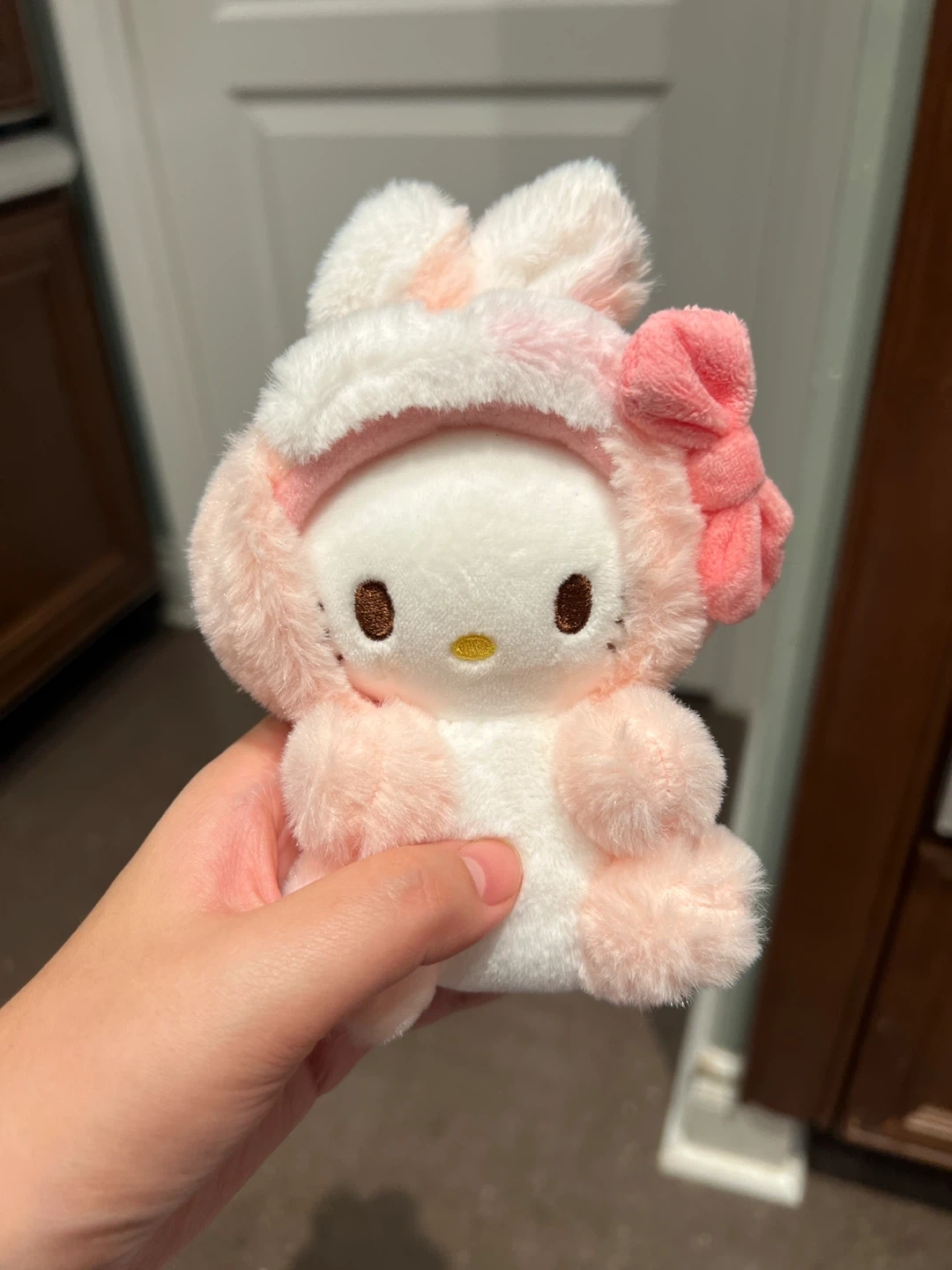 26Here's a super cute My Melody plushie dressed as a bunny! It's in great condition and ready for a new home. The plush is soft and features adorable details like a bunny hood and a pink bow