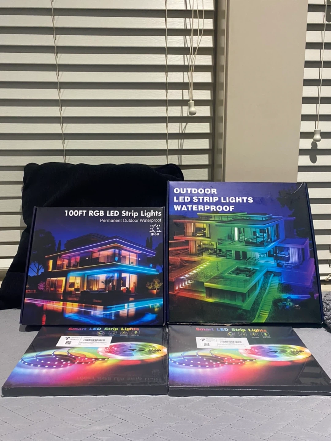 Get ready to light up your space with these 100FT RGB LED Strip Lights! They're perfect for both indoor and outdoor use, and are even waterproof. The box says they're "Permanent Outdoor Waterproof" and have an IP68 rating. They're also "Smart LED Strip Lights", so you can control them easily