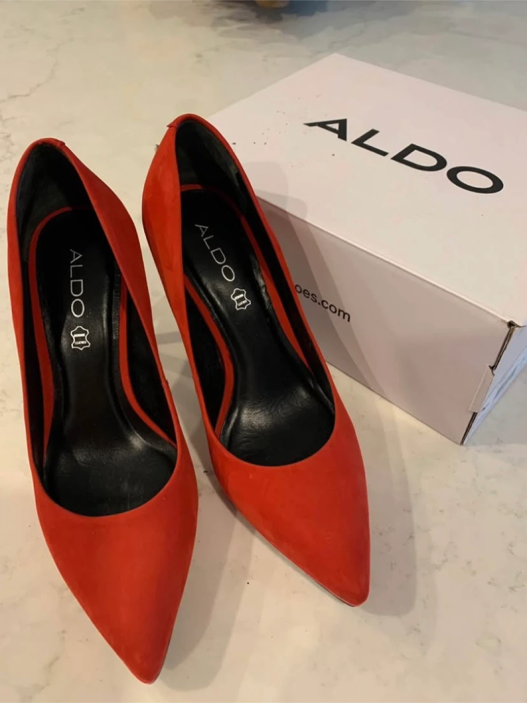 These are a pair of ALDO heels in a vibrant red suede! They are a size 8 and come with the original box. Perfect for adding a pop of color to any outfit!